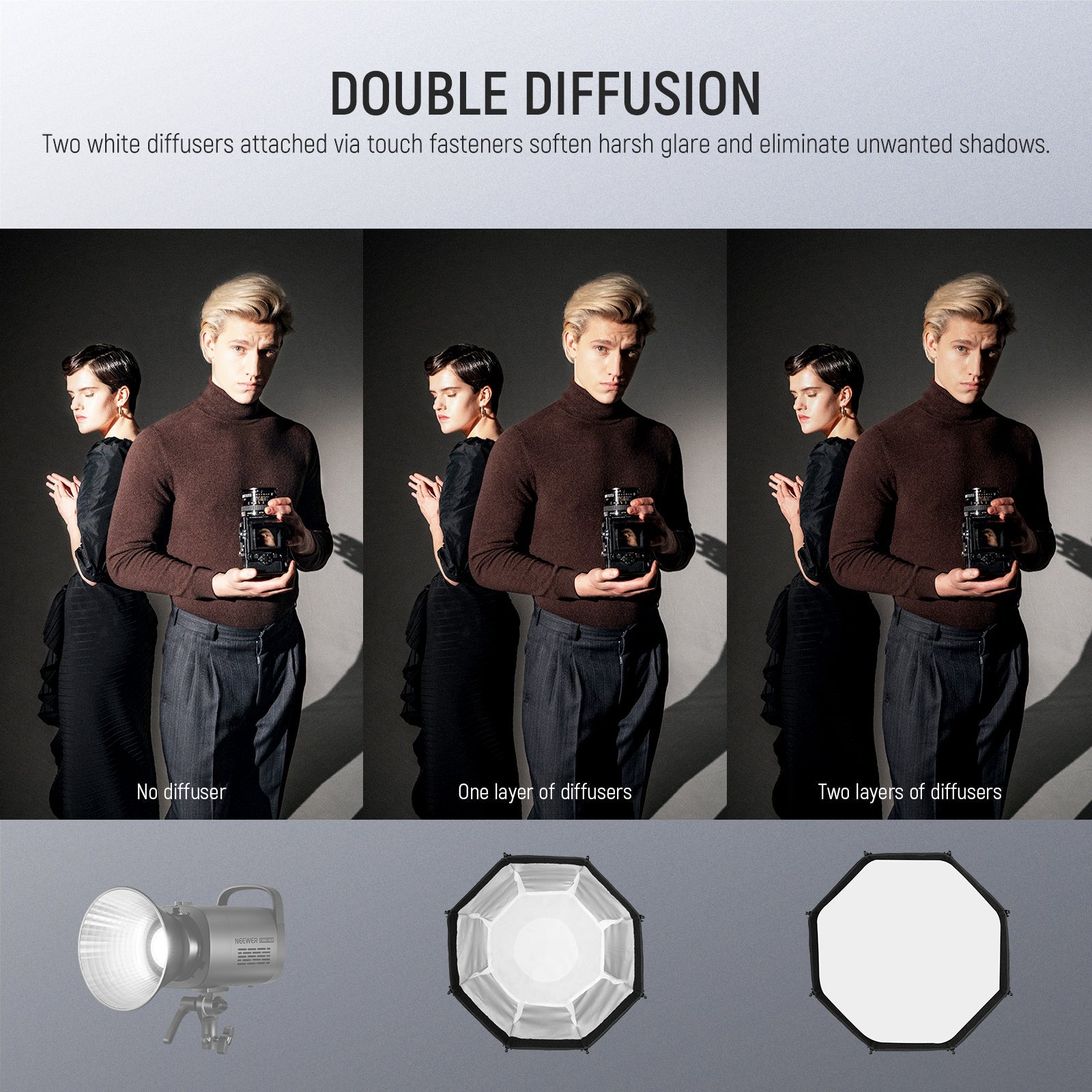 - 【Wabengitter und Diffusoren】 Die internen und externen Diffusoren können für ein noch weicheres und diffuseres Licht kombiniert werden und können zur einfachen Montage über Klettverschlüsse befestigt werden. Das Wabengitter lenkt das Licht im 45° Winkel und reduziert Streuverluste, wodurch ein unverwechselbarer weicher und dennoch ausdrucksstarker Lichteffekt entsteht, der die Gesichtsstruktur des Modells definiert