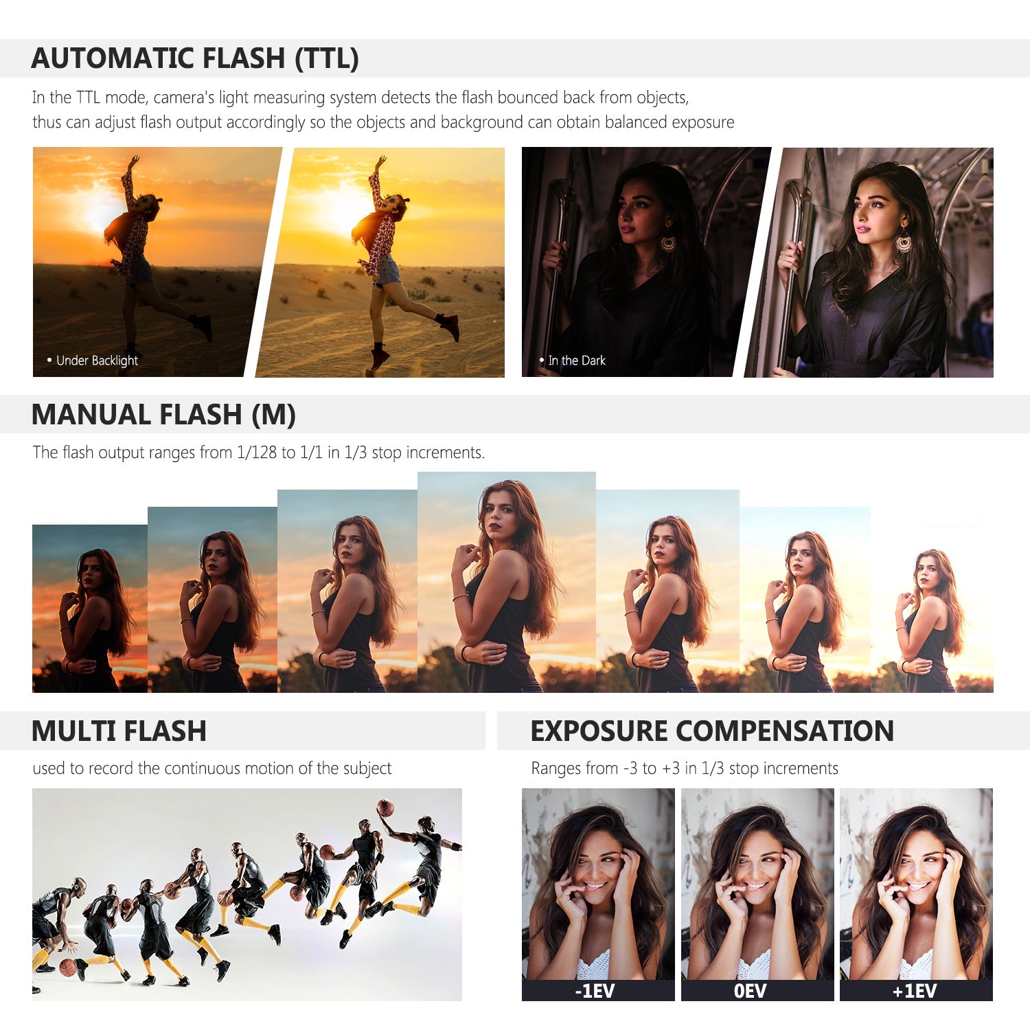 - Blitz-Modi: Drahtlos Aus, TTL/M/MUTIL (unterstützt Blitzbelichtungskorrektur)