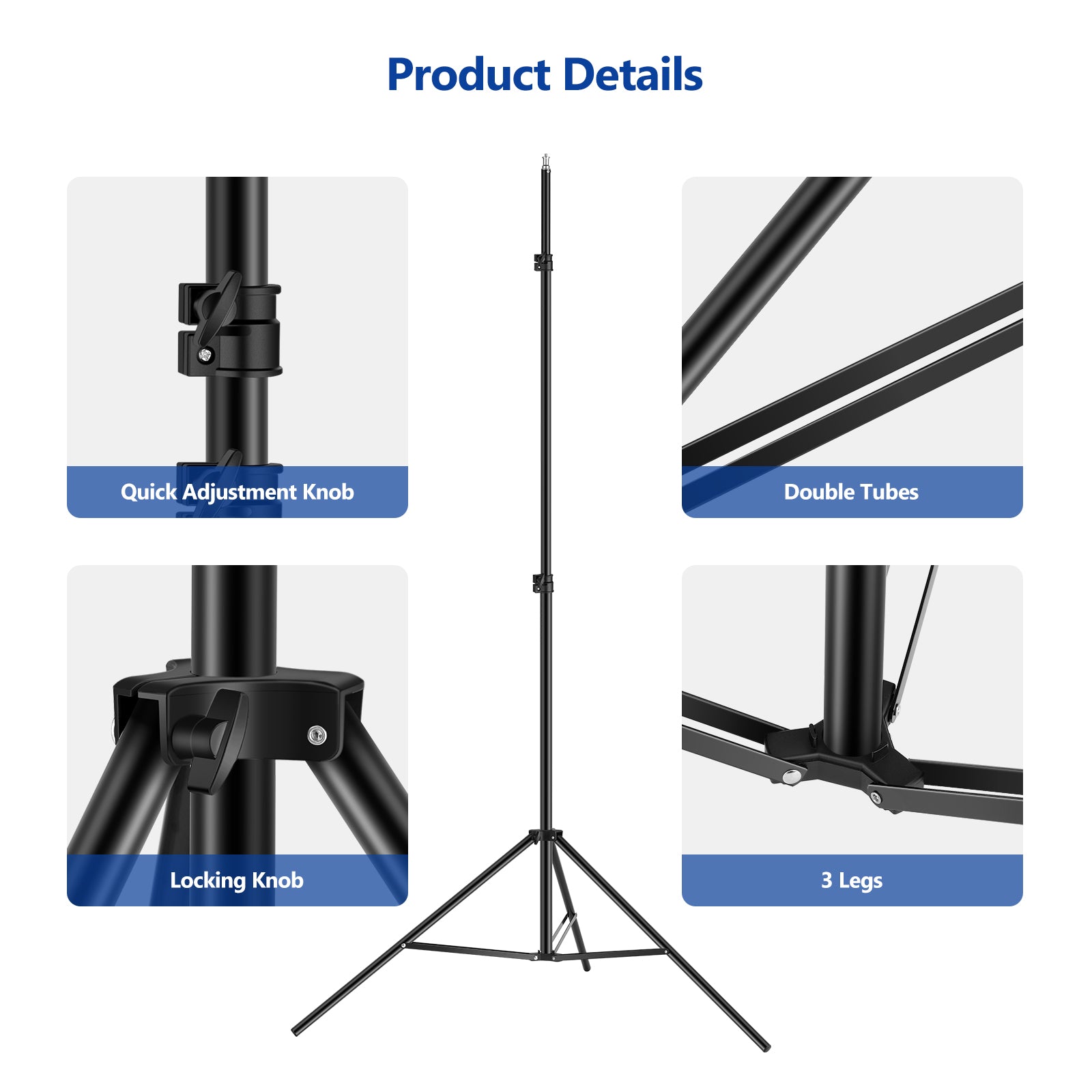 - Stabiler und verstellbarer Lichtständer: Der aus hochwertigem Metall gefertigte Lichtständer ist stark genug für den häufigen Gebrauch. Das 3-Bein-Stützdesign sorgt für Stabilität. Verwenden Sie den Höheneinstellknopf, um die Höhe des Lichtstativs einfach von 41,4"/105 cm bis 102,4"/260 cm einzustellen. Der Durchmesser jedes Abschnitts des Lichtstativs beträgt 1"/0,9"/0,75" (25 mm/22 mm/19 mm) von unten nach oben