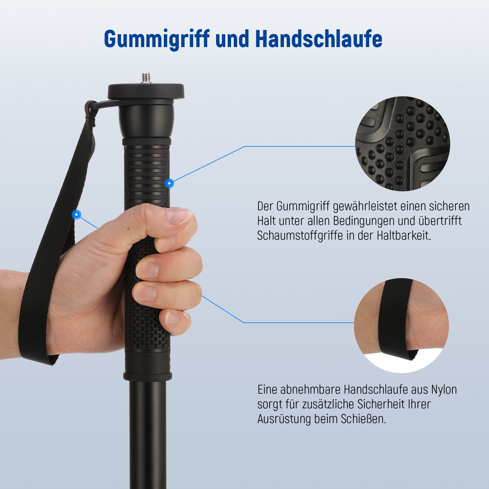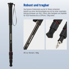 Gummigriff und Handschlaufe- Der Gummigriff ist so konzipiert, dass er ein Abrutschen verhindert, einen festen Halt unter allen Bedingungen gewährleistet und länger hält als Schaumstoffgriffe, die mit der Zeit verschleißen können. Darüber hinaus verfügt das Einbein Stativ über eine abnehmbare Nylon Handschlaufe für zusätzliche Sicherheit, sodass Ihre Ausrüstung während der Aufnahme sicher ist