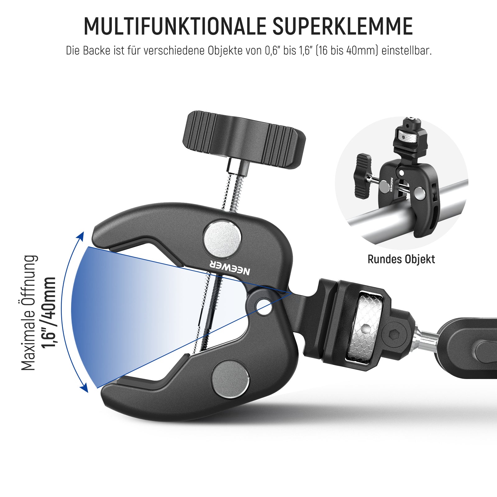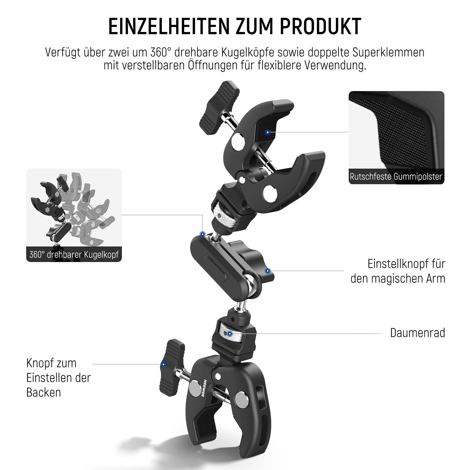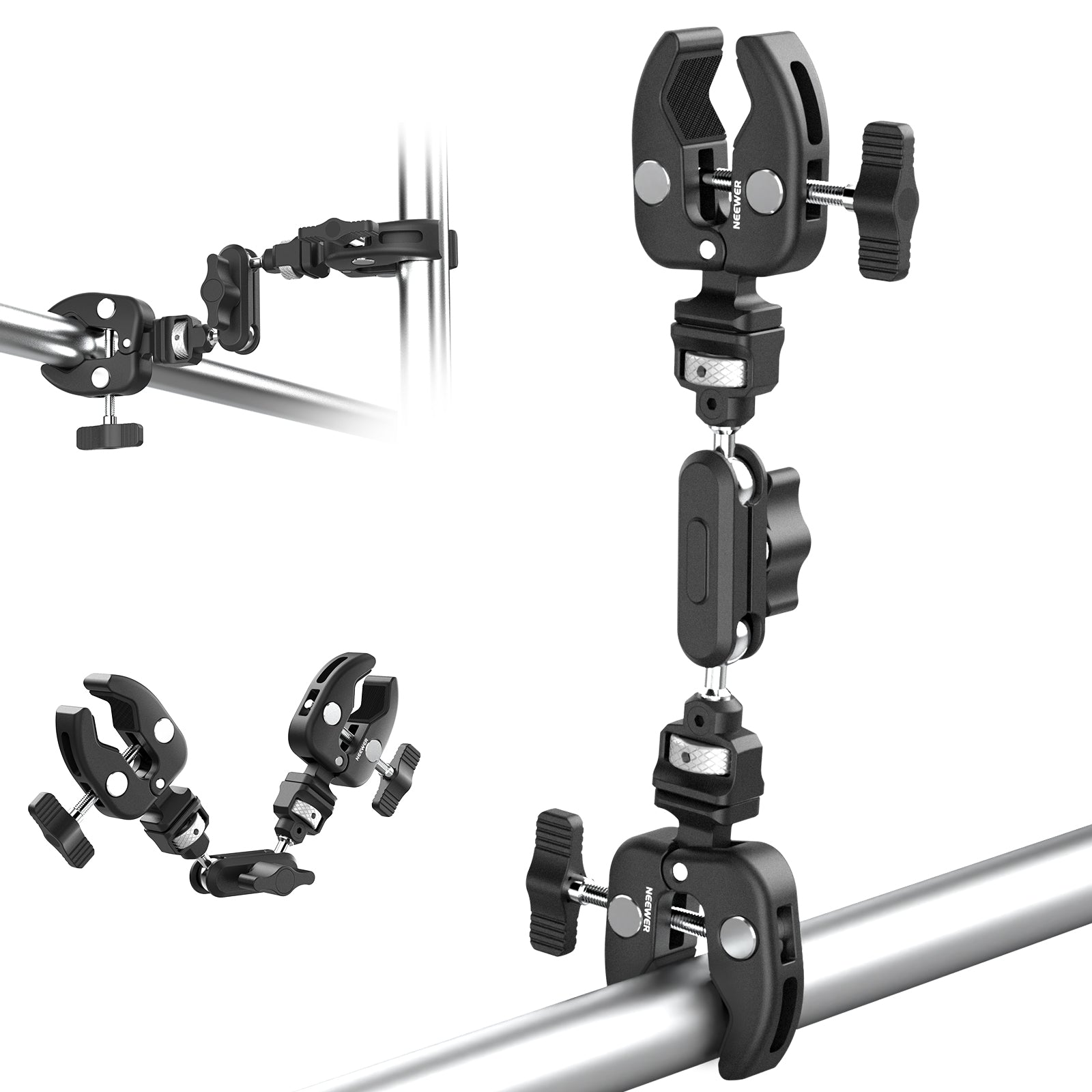 - Kugelkopf Magic Arm mit Super Klemmen- NEEWER UA060 Magic Arm mit doppelten kamera klemmen ist ein vielseitiges, praktisches und kostengünstiges Werkzeug für die stabile Montage von Geräten. Die rutschfesten Gummipolster an den Crab Clamp verhindern ein Verrutschen und schützen vor Kratzern, während die beiden um 360° drehbaren Kugelköpfe eine flexible Positionierung auf Rohrstangen oder flachen Oberflächen ermöglichen, ideal für Fotos und Videoaufnahmen im Freien