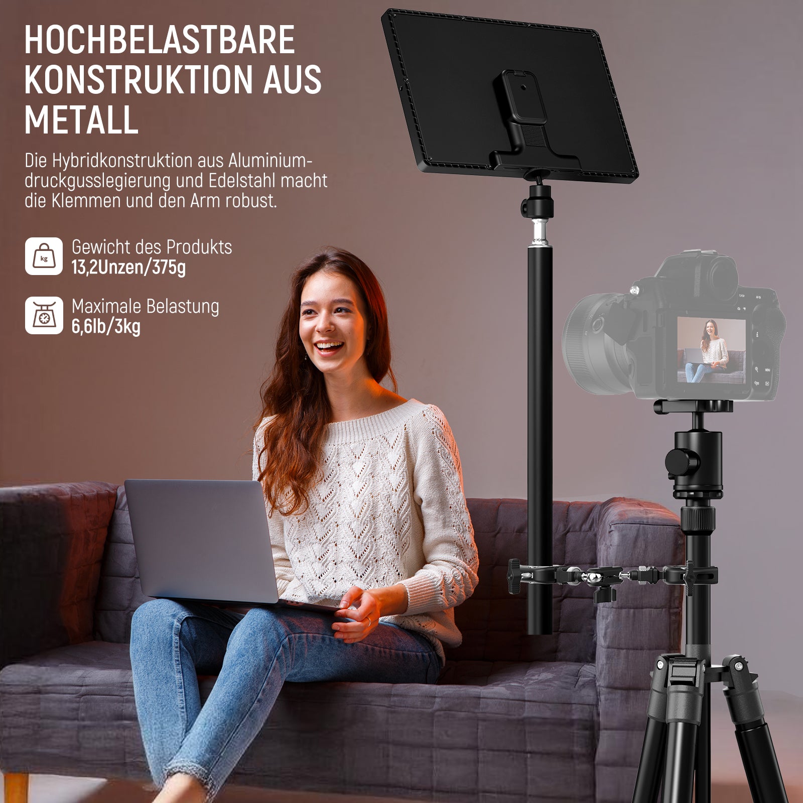 Hochbelastbare Metallkonstruktion- Die Hybridkonstruktion aus Aluminiumlegierung und Edelstahl, die im Druckguss eingesetzt wird, macht diese verstellbare Klemme Stativ und den Arm robust, kratzfest und hält diese Fotoausrüstung mit 13,2Unzen/375g leicht und trägt bis zu 6,6lb/3kg mit Leichtigkeit. Die abnehmbare Super Clamp ist über das 1/4" Schraubenloch auch mit Smallrig Magic Arms kompatibel, die mit Manfrotto Magic Arms kompatibel sind
