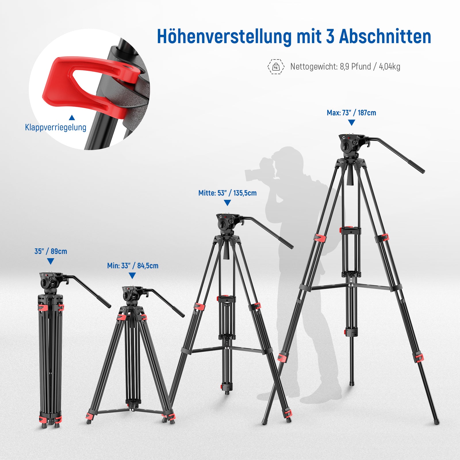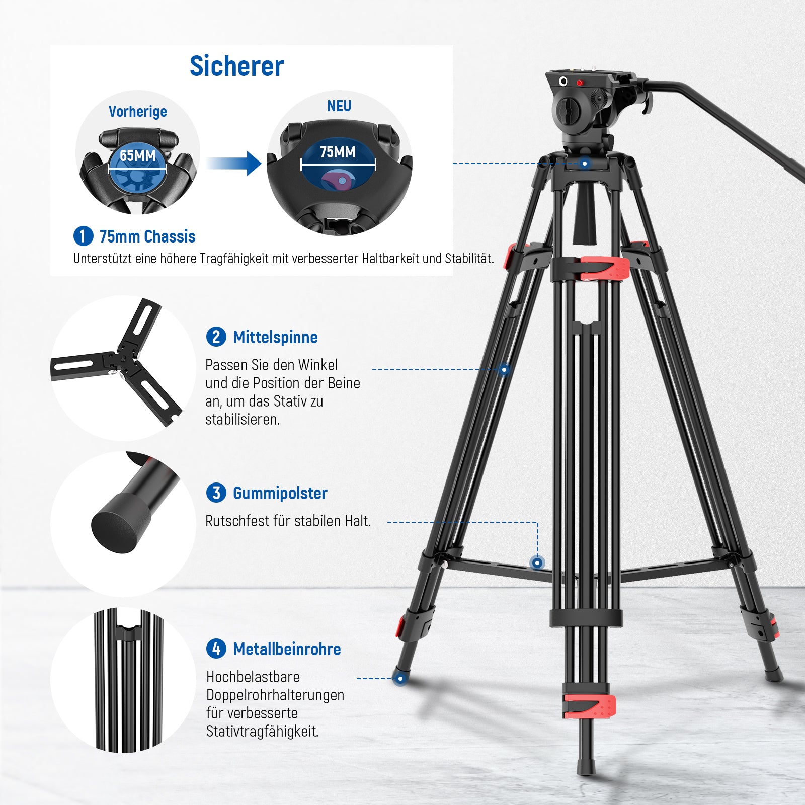 - Stabiles Metall Videostativ (Basisversion)- Dieses Metall Stativ mit Fluidkopf bietet außergewöhnliche Stabilität und Haltbarkeit und ist für den harten Einsatz ausgelegt. Jedes Stativbein besteht aus mehrreihigen Rohren mit einem dreieckigen Mittelspreizer und einem 73mm vergrößerten Chassis, das bis zu 8kg tragen kann. Die rutschfesten Gummifüße bieten stabilen Halt auf jedem Gelände und sind verschleißfest, perfekt für Film und Videoaufnahmen und ideal für Partys, Hochzeiten, Sport usw.
