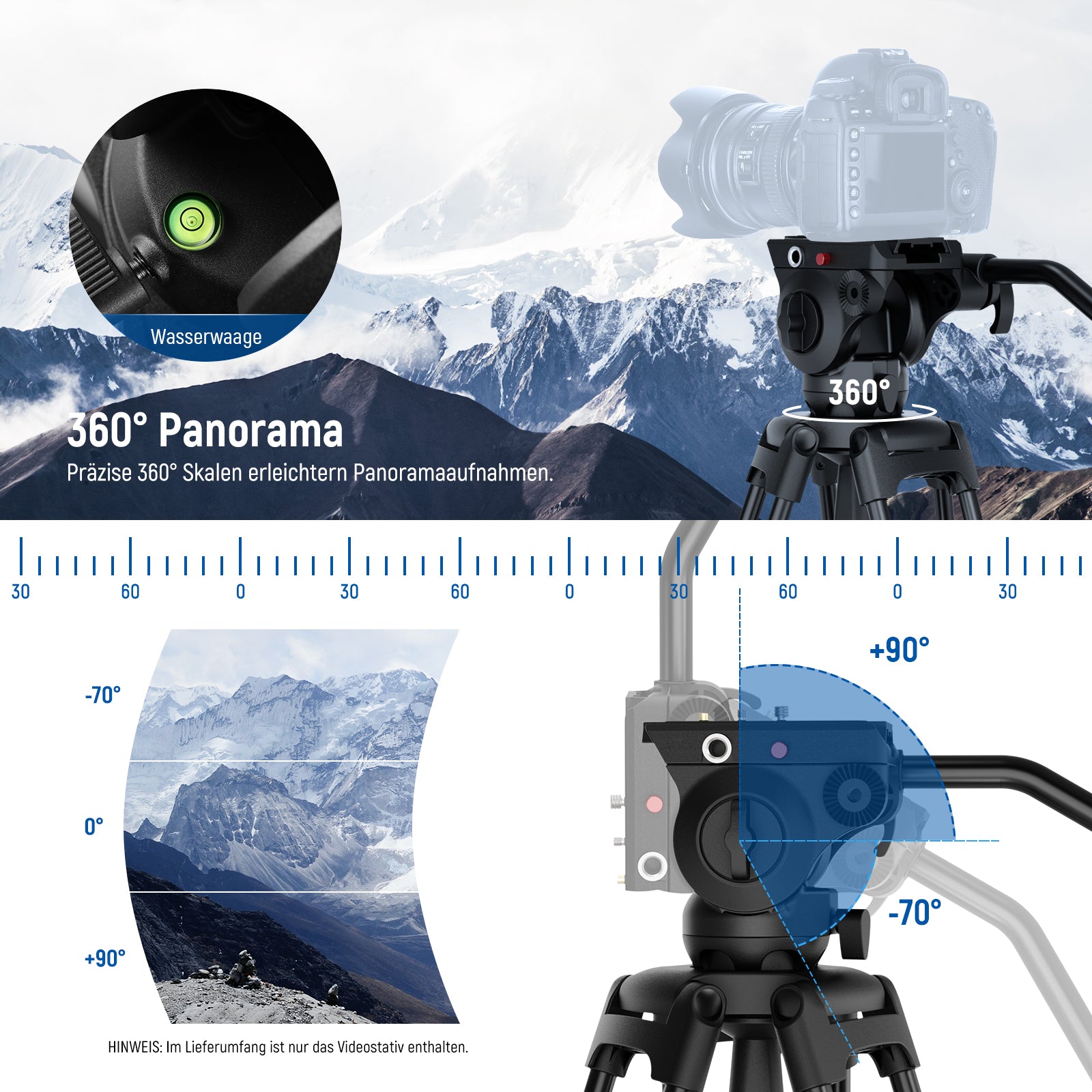 - Damped Fluid Head- Mit diesem Fluidkopf können Sie Videos in hoher Qualität aufnehmen. Er bietet 360° Schwenk und 70°/+90° Neigungswinkel für vielseitige Aufnahmewinkel sowie sanfte und kontrollierte Bewegungen. Enthält auch eine Wasserwaage für eine schnelle, genaue horizontale Ausrichtung und einen abnehmbaren Griff für eine andere dominante Hand