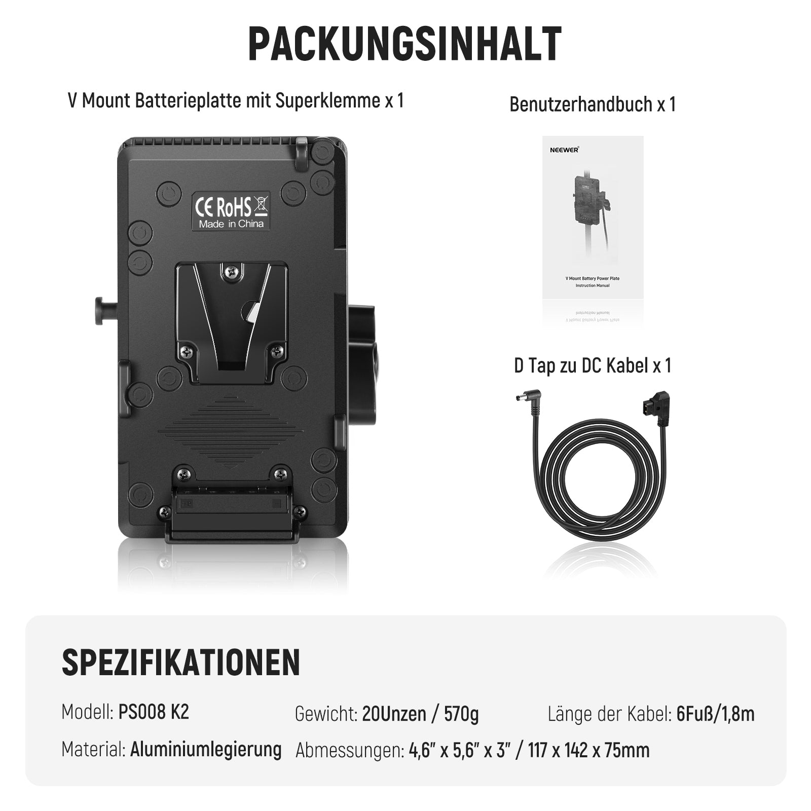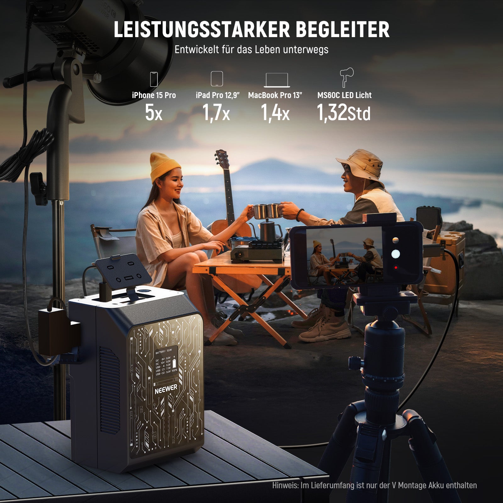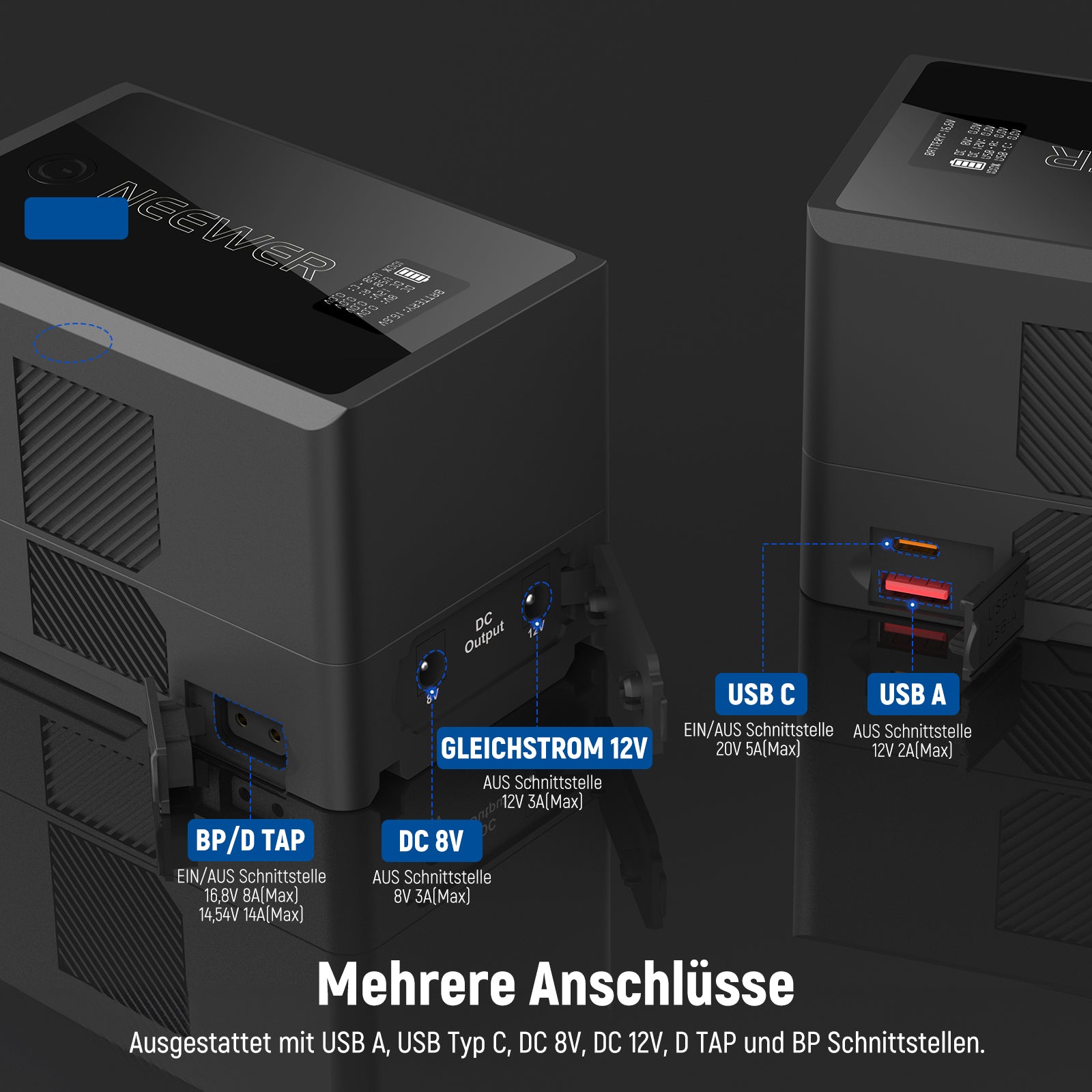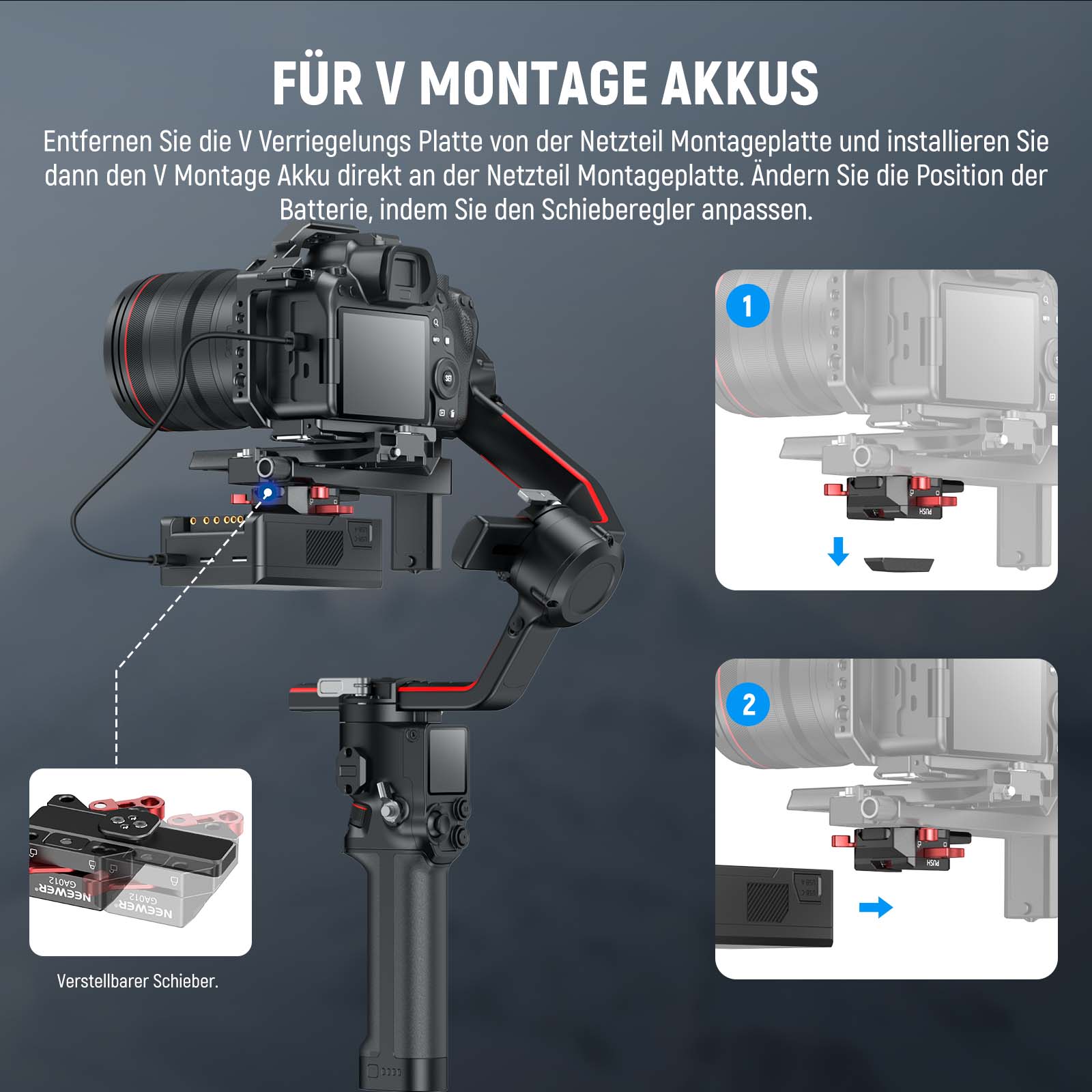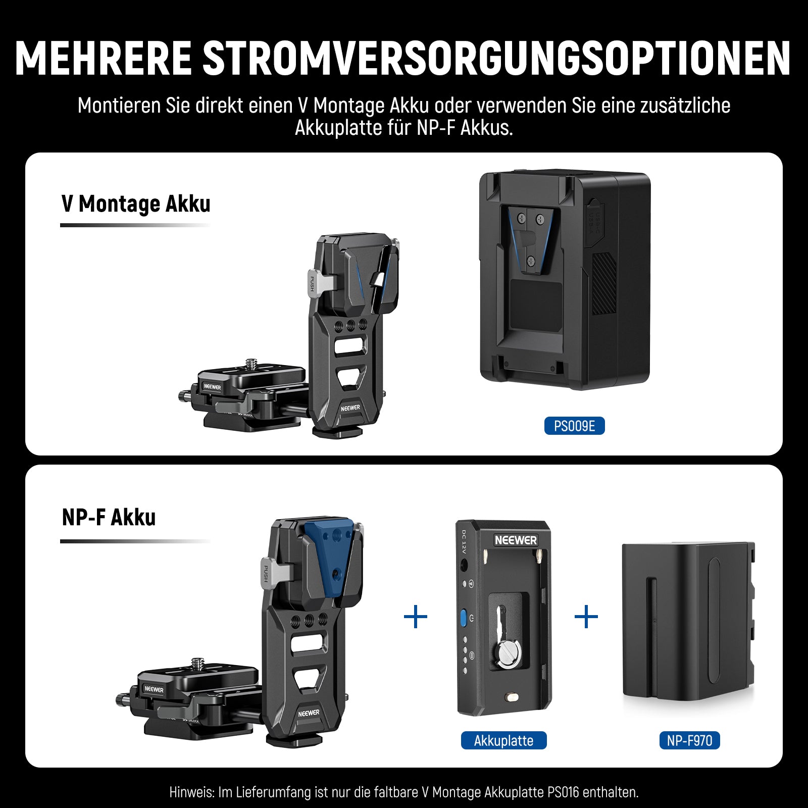 NEEWER bietet Ihnen V-Mount-Akkus an. Diese kompakten, aber leistungsstarken V-Mount-Akkus eignen sich hervorragend für kontinuierliche Videobeleuchtung und Fotografie. Die meisten V-Mount-Akkus sind für den Lufttransport geeignet und fügen Ihrem Gepäck kein zusätzliches Gewicht hinzu. Darüber hinaus bietet NEEWER auch V-Mount-Akkuladeplatten und Ladegeräte an.