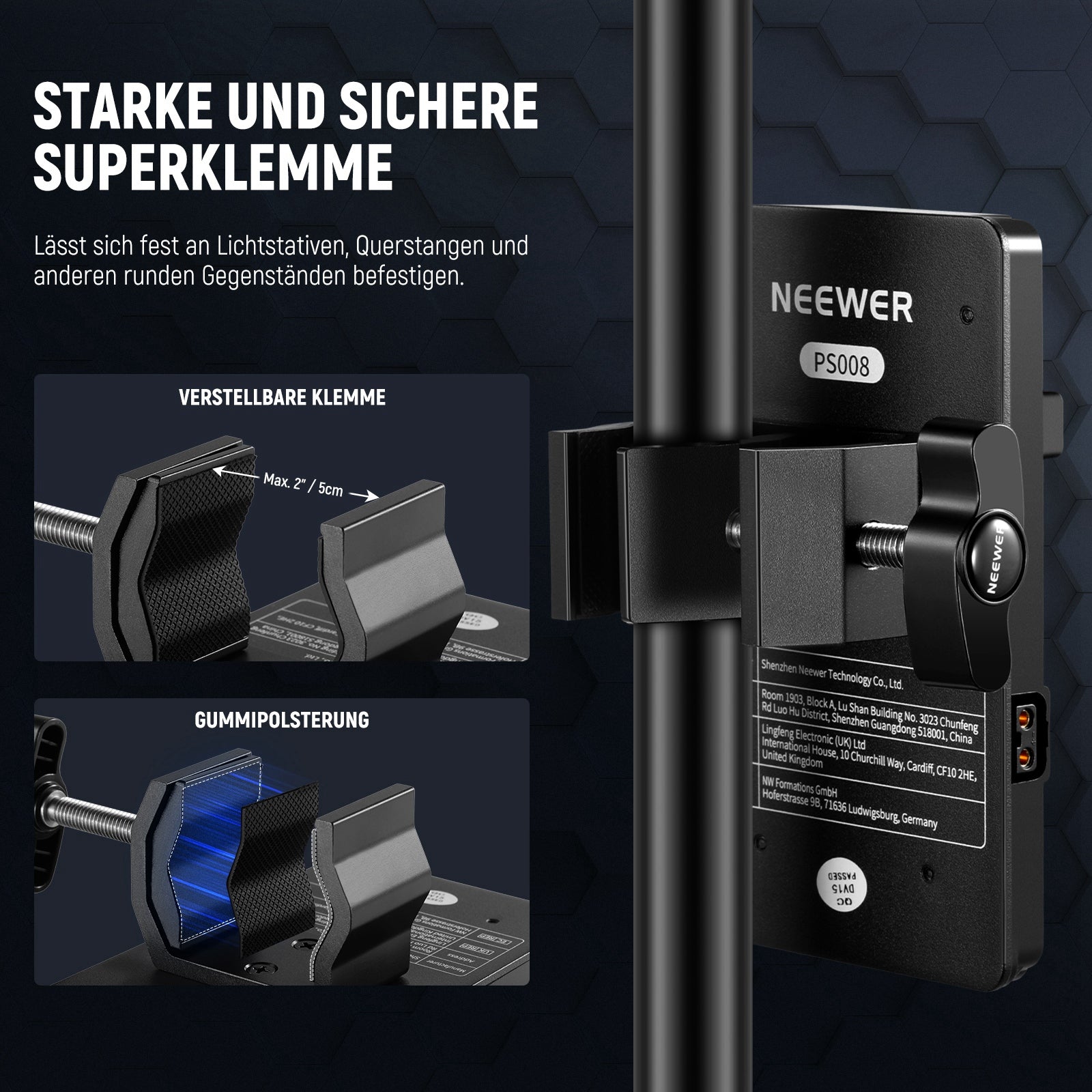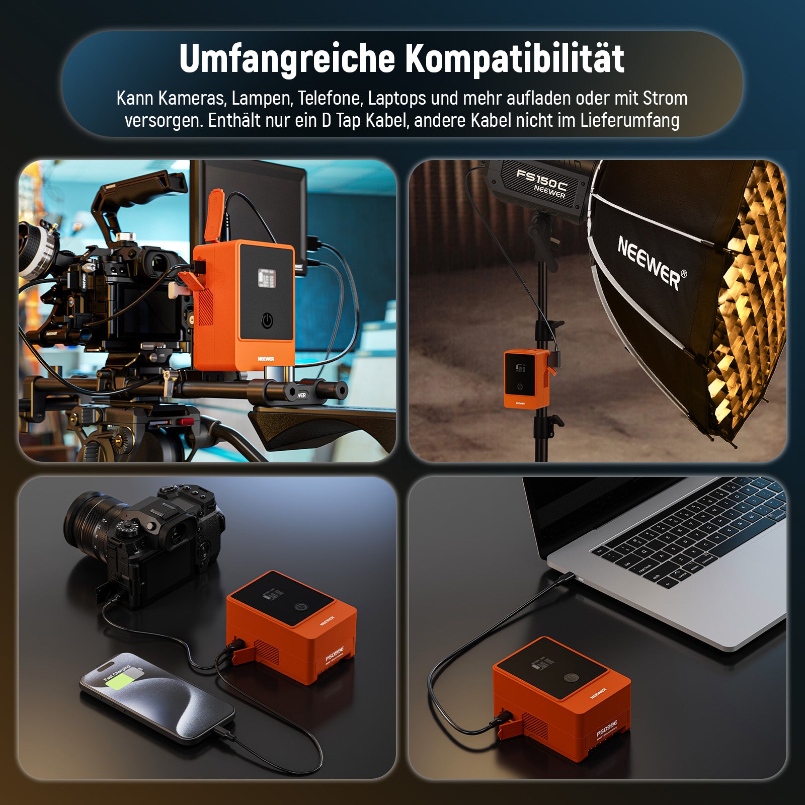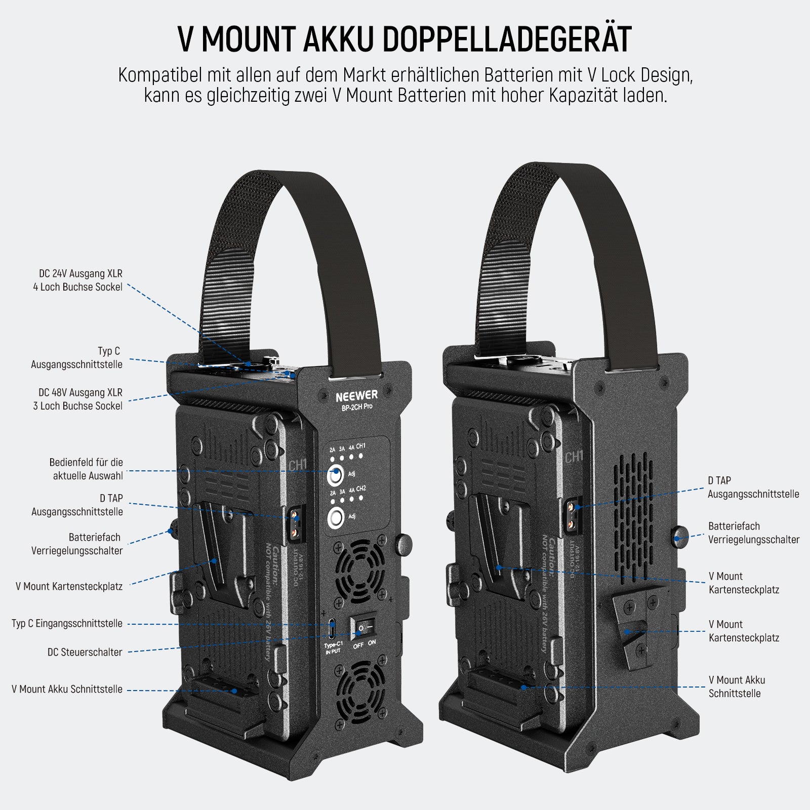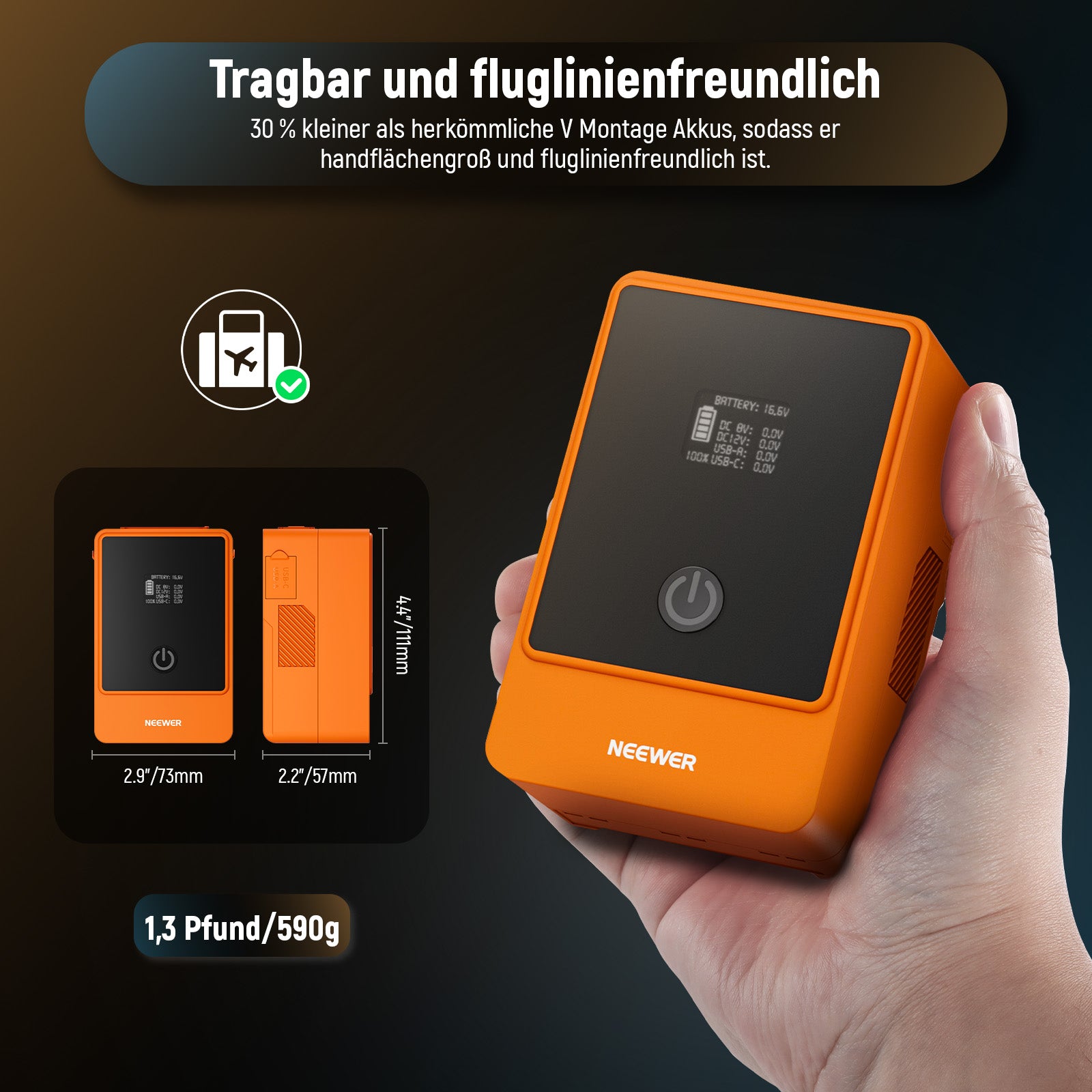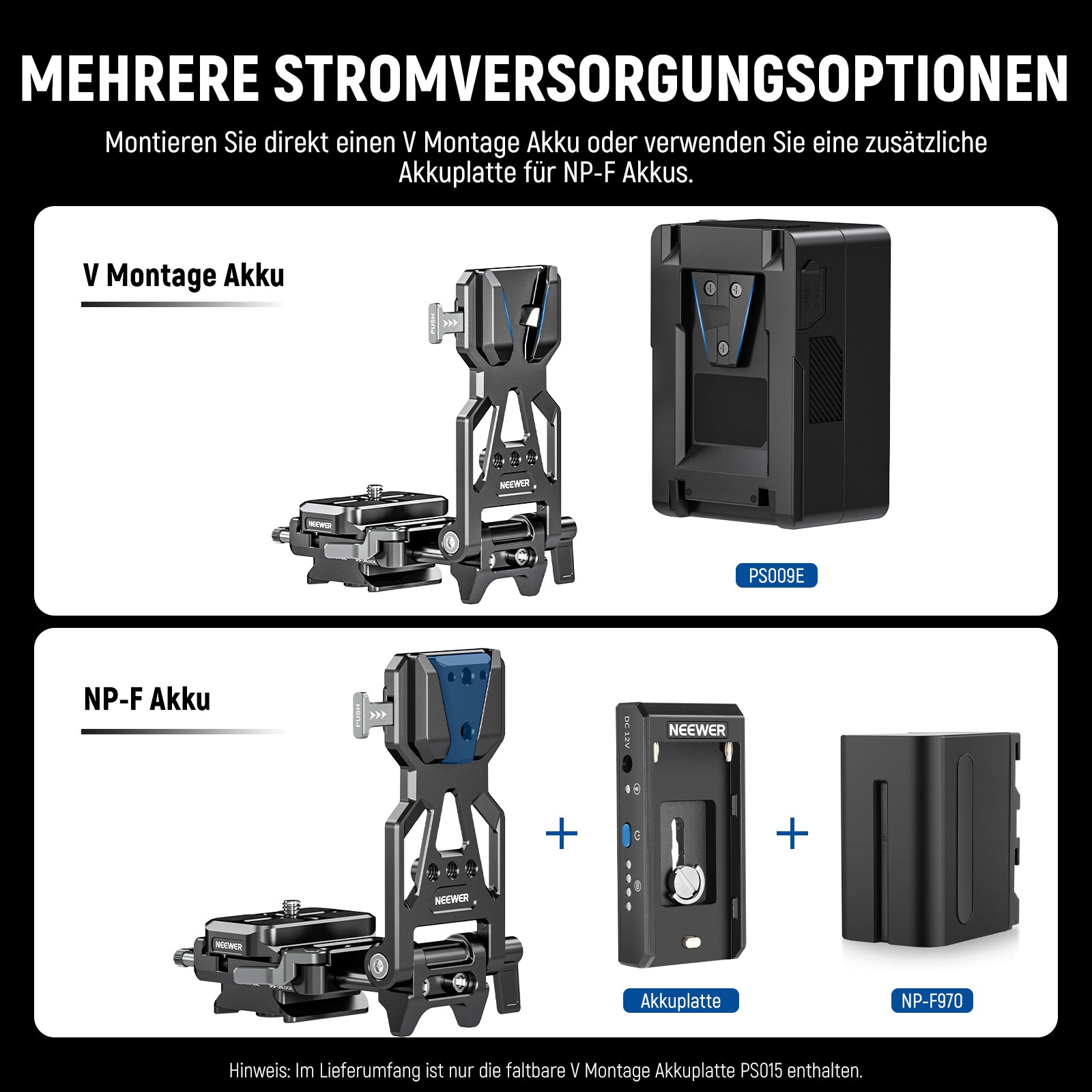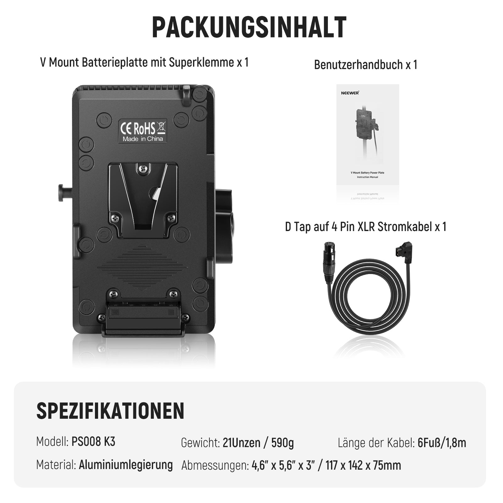 NEEWER bietet Ihnen V-Mount-Akkus an. Diese kompakten, aber leistungsstarken V-Mount-Akkus eignen sich hervorragend für kontinuierliche Videobeleuchtung und Fotografie. Die meisten V-Mount-Akkus sind für den Lufttransport geeignet und fügen Ihrem Gepäck kein zusätzliches Gewicht hinzu. Darüber hinaus bietet NEEWER auch V-Mount-Akkuladeplatten und Ladegeräte an.