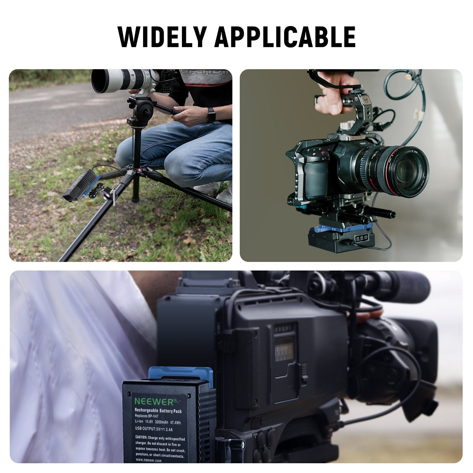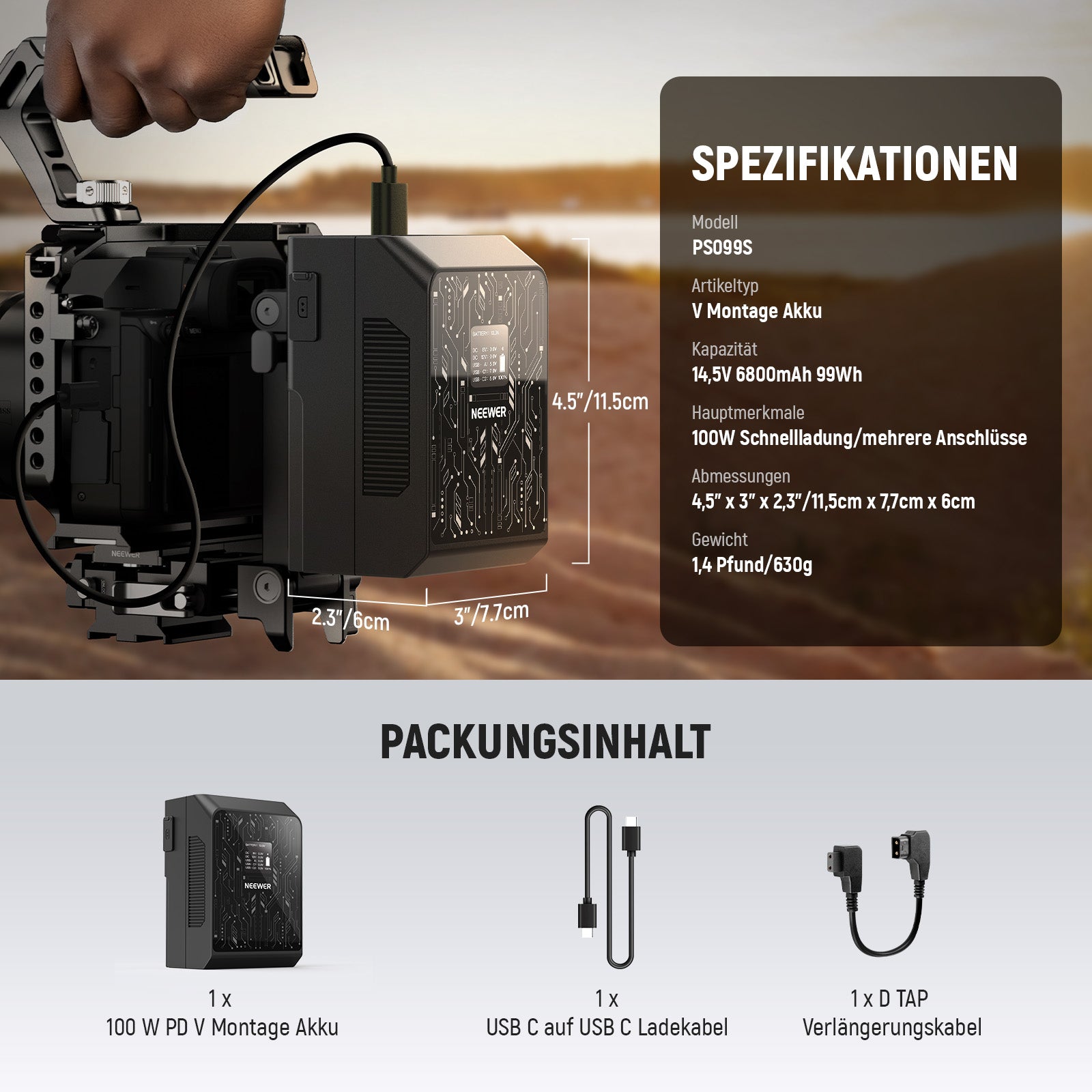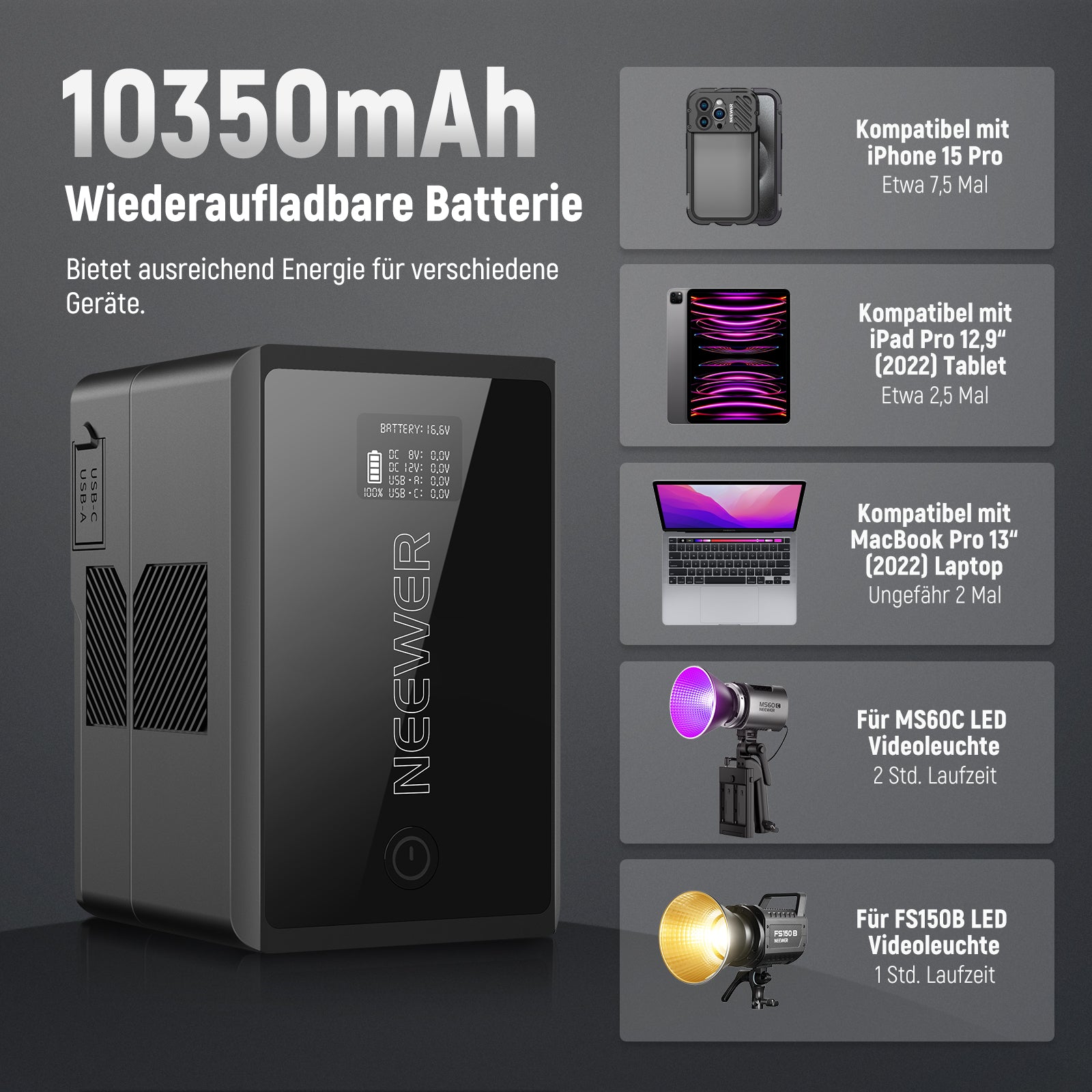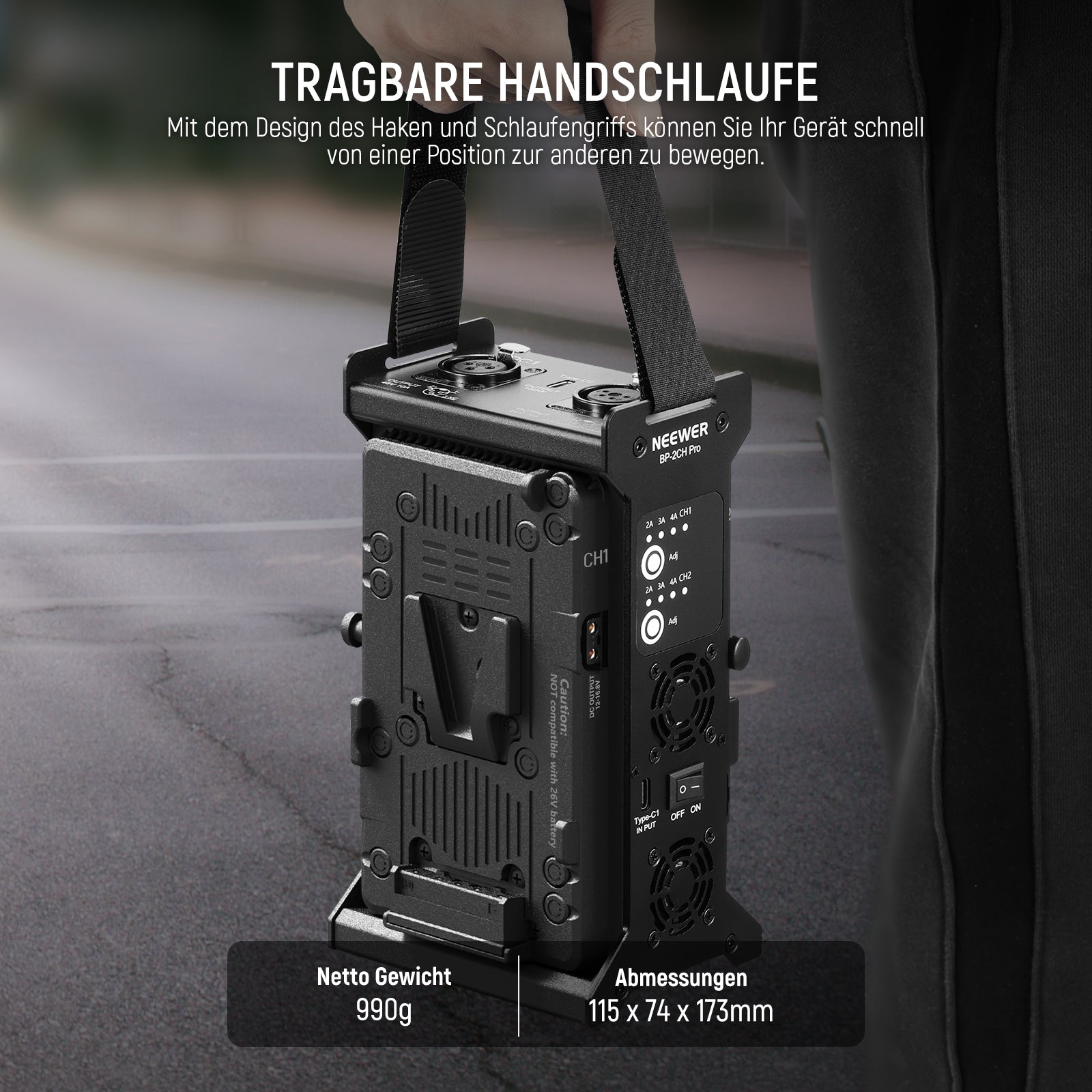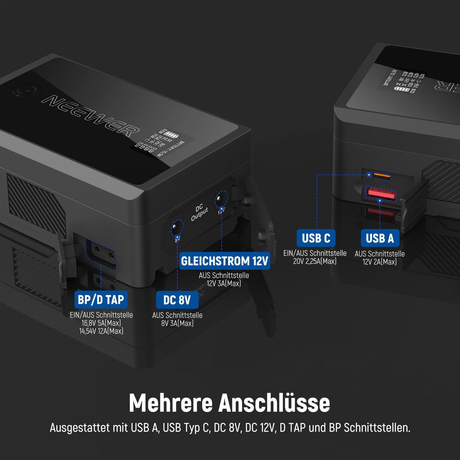 NEEWER bietet Ihnen V-Mount-Akkus an. Diese kompakten, aber leistungsstarken V-Mount-Akkus eignen sich hervorragend für kontinuierliche Videobeleuchtung und Fotografie. Die meisten V-Mount-Akkus sind für den Lufttransport geeignet und fügen Ihrem Gepäck kein zusätzliches Gewicht hinzu. Darüber hinaus bietet NEEWER auch V-Mount-Akkuladeplatten und Ladegeräte an.