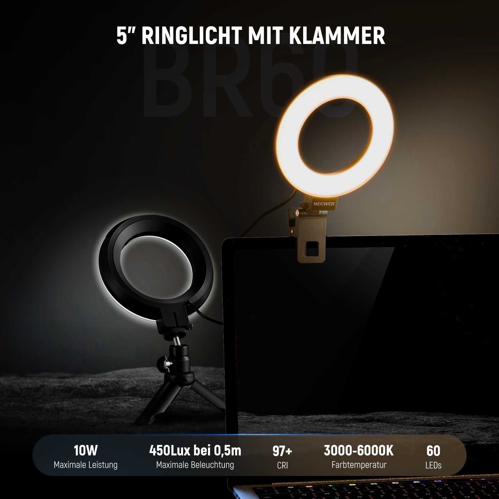 - Multifunktionales LED Fülllicht mit Clip- Ausgestattet mit 60 LEDs bietet NEEWER BR60 Ringlicht eine Beleuchtung von bis zu 450Lux bei 0,5m, 3000K-6000K Farbtemperatur und CRI>97. Das Clip On Lampe kann an Smartphones, Laptops, Computern, Desktop Monitoren und Bildschirmen mit einer Dicke von weniger als 1" / 2,5cm montiert werden und enthält ein Mini Stativ für den vielseitigen Einsatz in Makeup, Selfies, Tiktok / Youtube Videoaufnahmen, Facetime, Zoom Anrufen, Videokonferenzen, Vlogging usw
