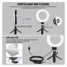 Einstellbar und flexibel- Die Selfie Leuchte für das Telefon bietet, wenn es am Clip befestigt ist, ein 360° Panorama und eine Neigung von 170° für Videoaufnahmen oder Aufhelllicht. Auf einem Stativ montiert, kann das kompakte Ringlicht um 360° horizontal und 135° vertikal gedreht werden und ist mit einer Höhe von 9cm flexibel einsetzbar. Hinweis: Montieren Sie den Clip mit einem Loch auf der Seite der Kamera, um ein Blockieren des Objektivs zu vermeiden