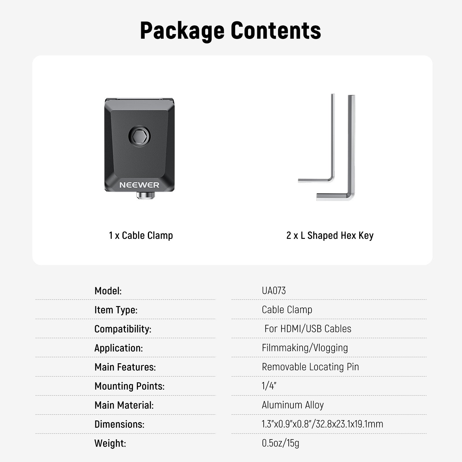 - Universelle 1/4" Befestigungsschraube- Mit einer 1/4" Schraube kann der Kabelhalter mit einem L förmigen Inbusschlüssel fest an einem Kamerakäfig, einer L Platte, einer Grundplatte, einem Video Rig und einem Telefonkäfigstabilisator befestigt werden