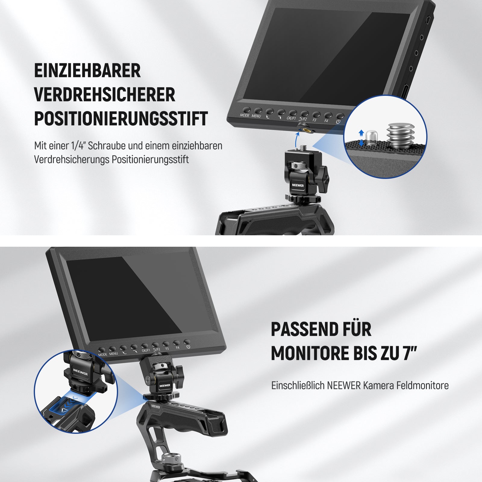 - Einziehbarer Verdrehungssichere Positionierungsstift- Mit einer 1/4" Schraube und einem einziehbaren verdrehungssicheren Positionierungsstift ist die Feldmonitorhalterung mit Atomos Ninja V Ninja V+ und anderen Monitoren mit oder ohne Positionierungsloch kompatibel, wie z. B. NEEWER F100/F200 /F400 PRO/F500