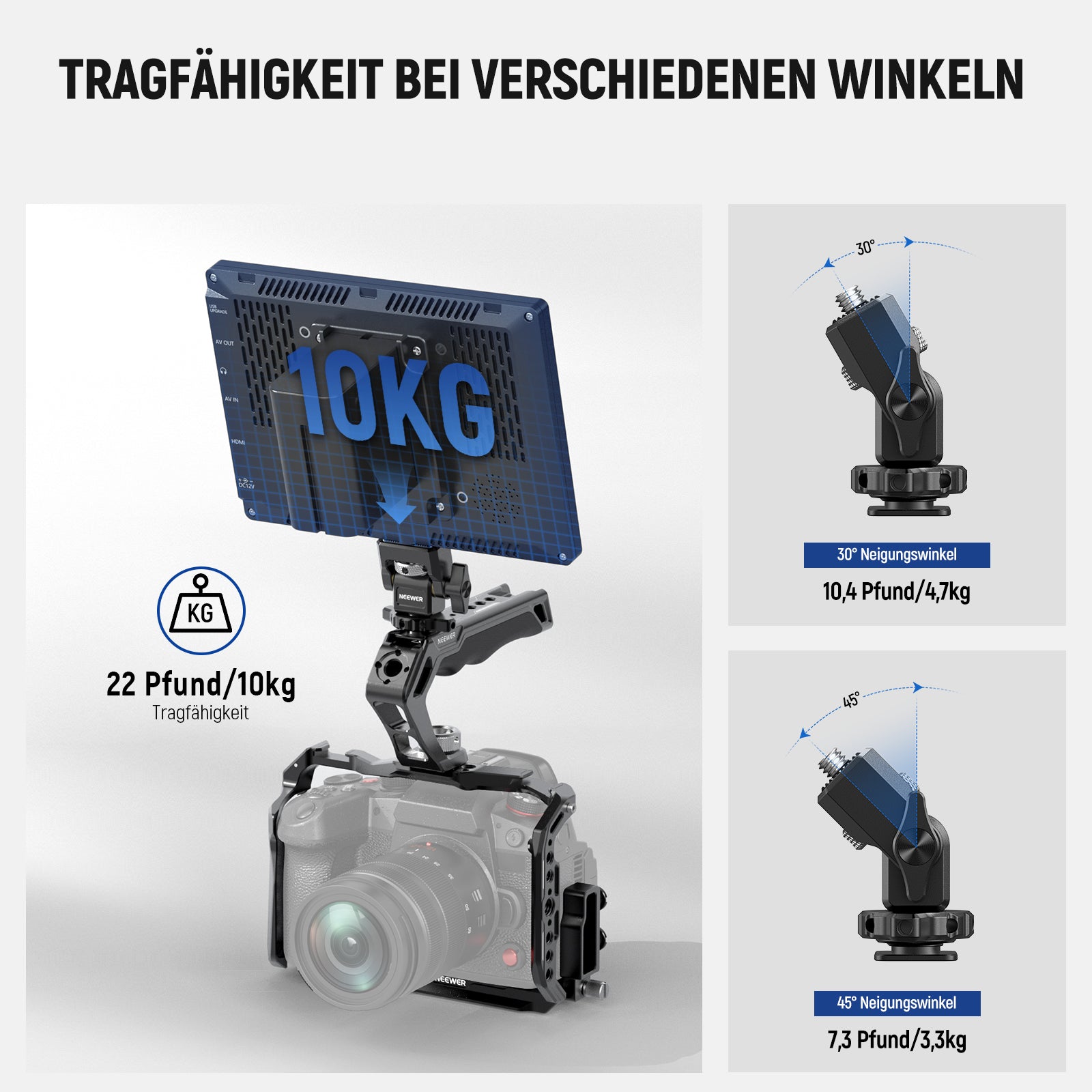 - 360° Schwenkung und 180° Neigung mit Dämpfung- Die Kaltschuhadapter bietet eine 360° Schwenkung und 180° Neigung mit Dämpfung für eine präzise Winkeleinstellung basierend auf dem tatsächlichen Gewicht des Feldmonitors. Die Tragfähigkeit variiert je nach Neigungswinkel und beträgt 10,4 Pfund/4,7kg bei 30° und 7,3 Pfund/3,3kg bei 45°, was hoch genug ist, um einen Kamera monitor sicher daran zu befestigen