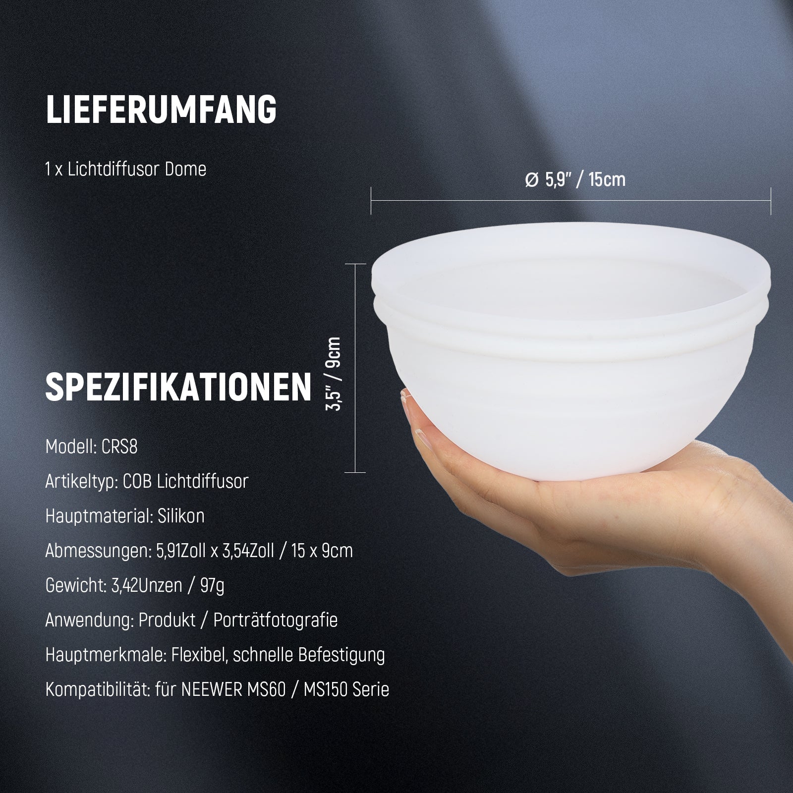 - Für NEEWER MS60/150 COB Leuchten- Dieser Silikon Diffusor Dome wurde speziell für die Montage auf den Reflektoren der NEEWER MS60 MS60B MS60C MS150 MS150B MS150C LED Videoleuchten entwickelt