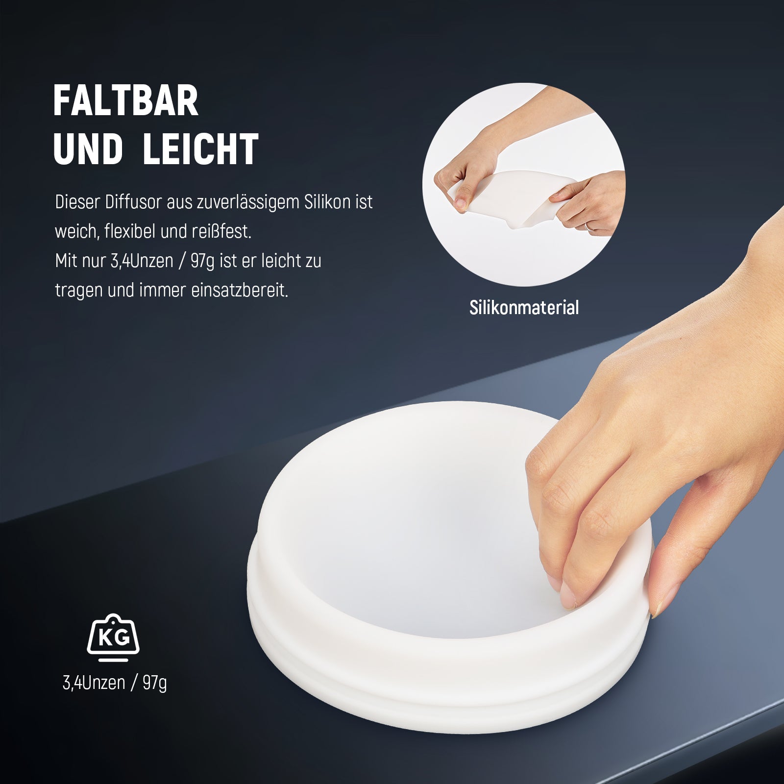Faltbar und Tragbar- Der faltbare Silikondiffusor für den Reflektor der MS60/150 Beleuchtung Ausrüstungsabdeckung wiegt nur 97g, hat Abmessungen von 15 x 9cm und nimmt nur wenig Platz in Ihrem Rucksack oder Ihrer Fotoausrüstungstasche ein. Ideal als unverzichtbares Foto Beleuchtungszubehör für professionelle Fotografen bei Studiofotografie, Videoaufnahmen, Streaming, Filmen sowie für Content Creator und Social Media Influencer unterwegs