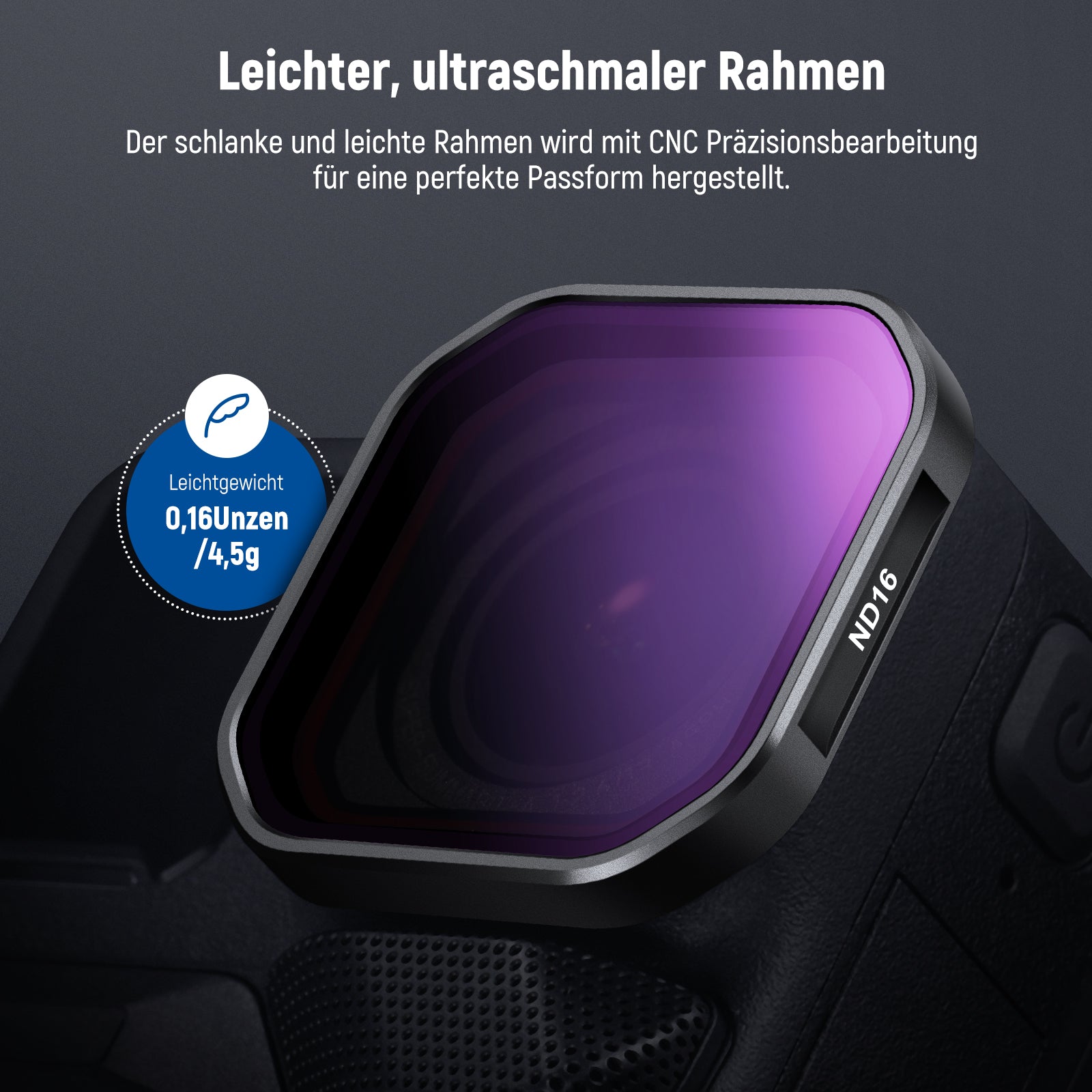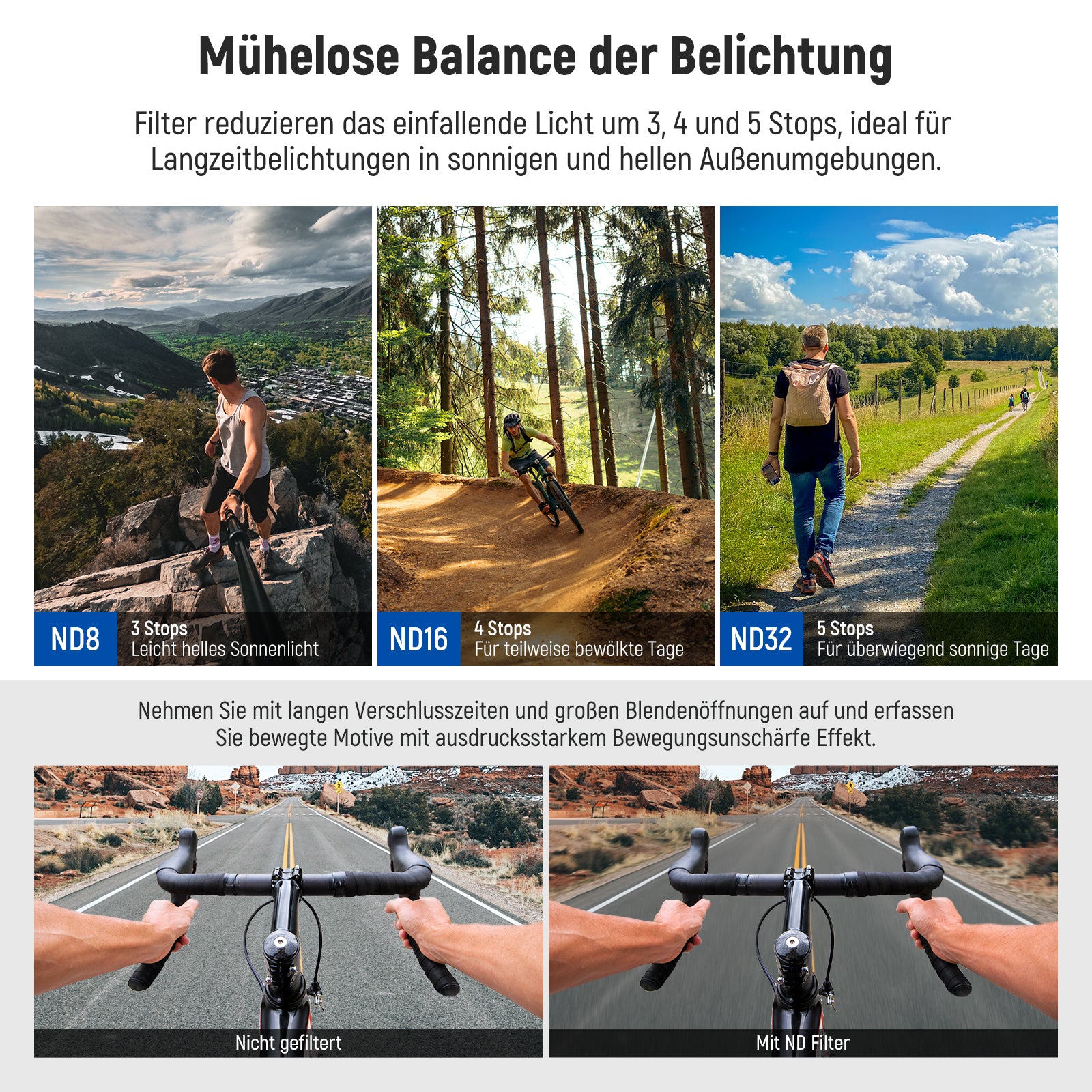 - Aufnahme perfekt belichteter Bilder- ND8, ND16 und ND32 Filter reduzieren das Licht um 3, 4 bzw. 5 Stops, perfekt für Langzeitbelichtungen bei hellem Sonnenlicht. Sie ermöglichen Aufnahmen mit längeren Verschlusszeiten und größeren Blendenöffnungen sowie die Aufnahme bewegter Motive mit dynamischen Bewegungsunschärfeeffekten