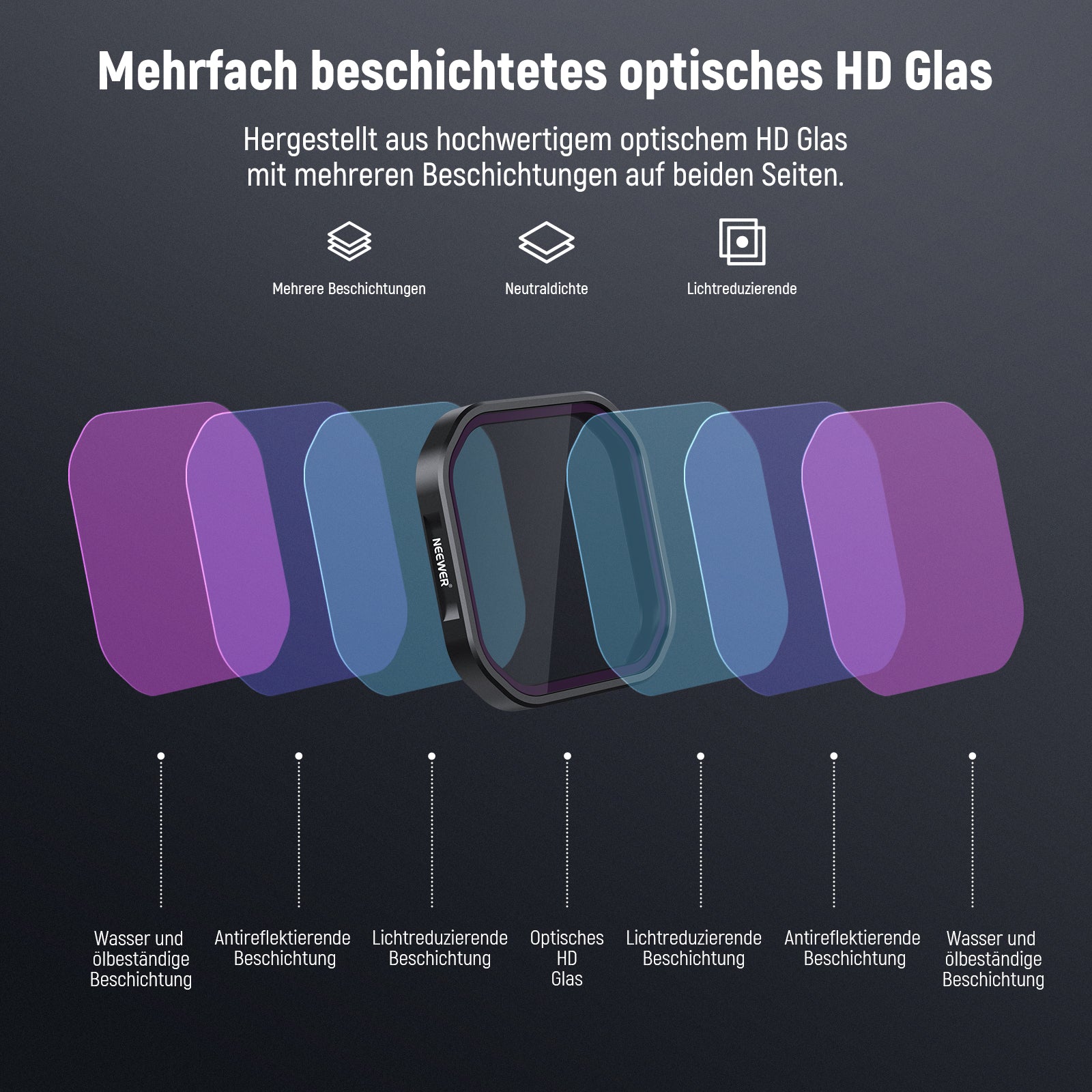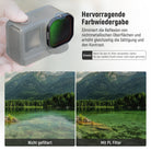 - Mehrfach beschichtetes optisches HD Glas- Optisches HD Glas sorgt für hohe Klarheit und präzise Farbwiedergabe. Mehrere Beschichtungen auf beiden Seiten des Glases sind resistent gegen Wasser, Fingerabdrücke, Schmutz und Kratzer, sodass die Filter leicht zu reinigen sind