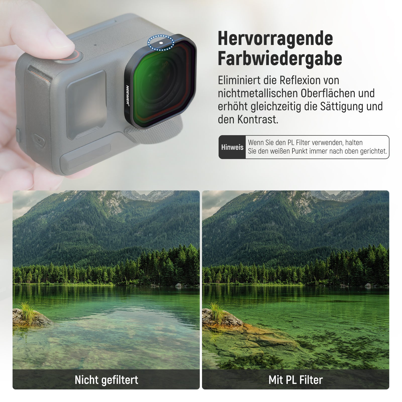 - Sättigung und Kontrast erhöhen- Der PL Filter (Polarisationsfilter) minimiert Reflexionen auf nichtmetallischen Oberflächen wie Glas und Wasser und verbessert Sättigung und Kontrast für lebendige Farben. Hinweis: Halten Sie den weißen Punkt immer nach oben, wenn Sie den PL Filter verwenden
