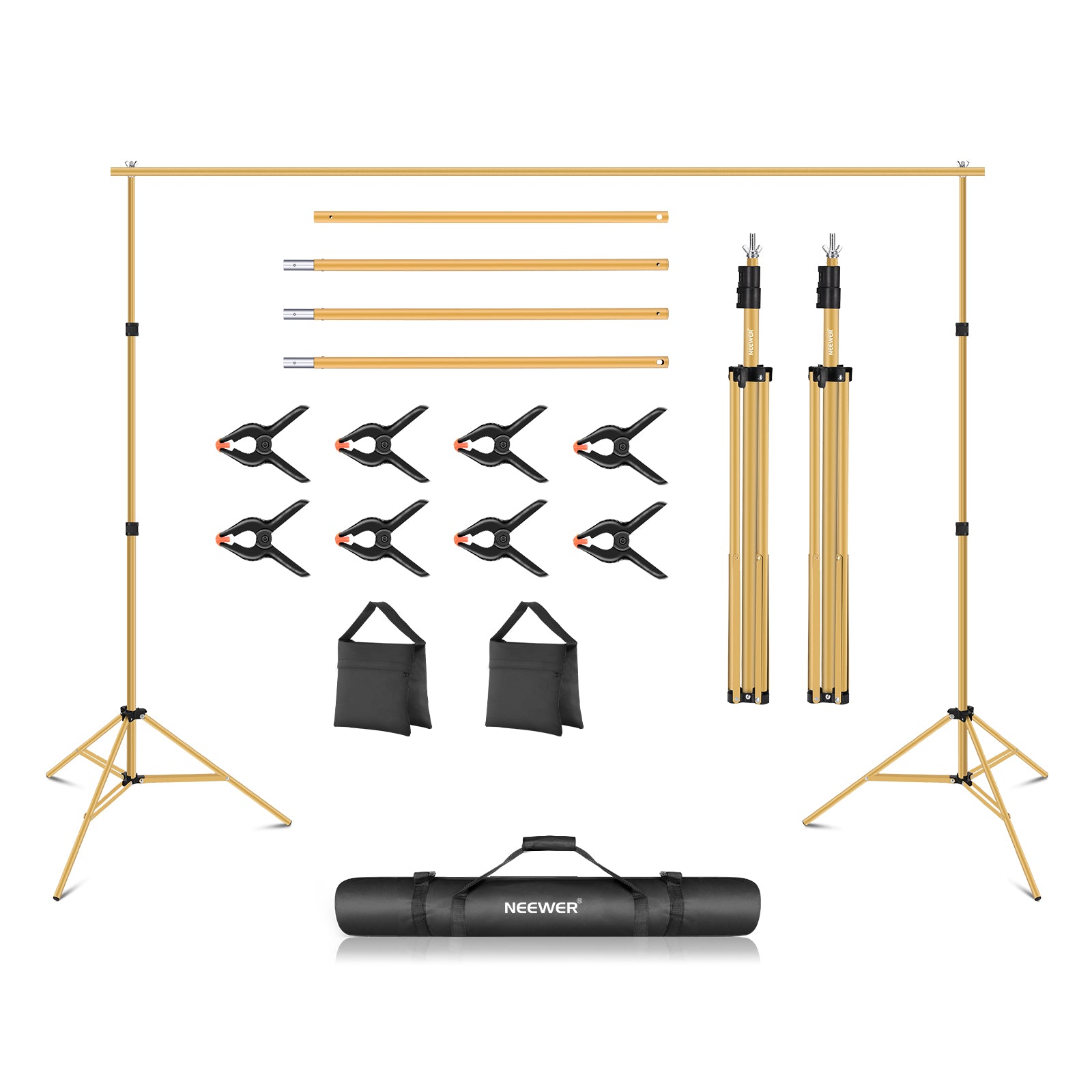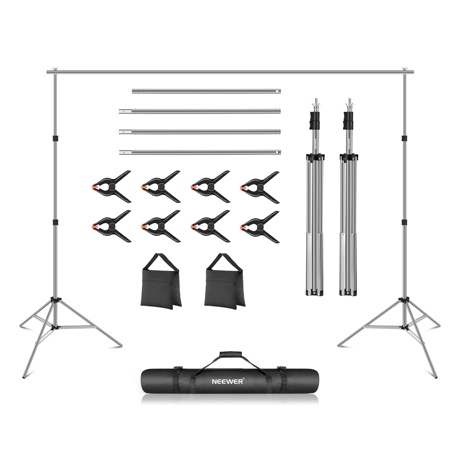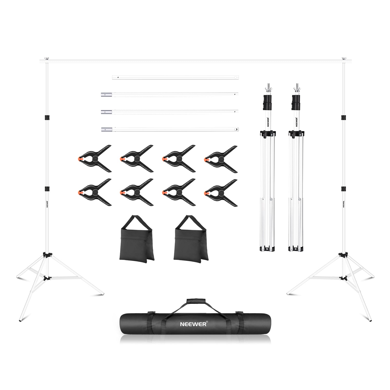 - Lieferumfang: NEEWER Hintergrund Stativ 2er Packung, vier Querstangen, acht Hintergund Federklemmen, zwei leere Sandsäcke, Tragetasche, Bedienungsanleitung