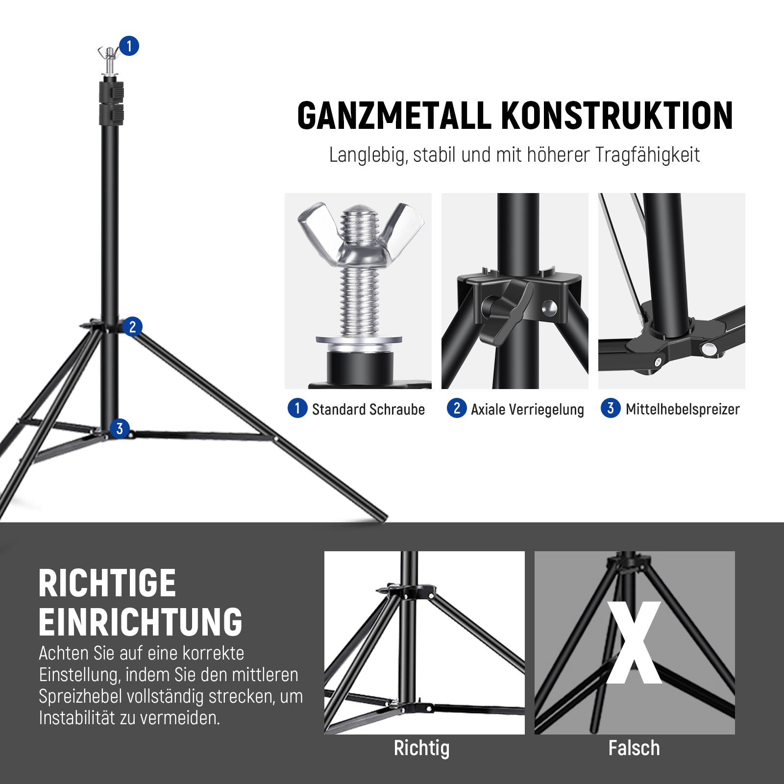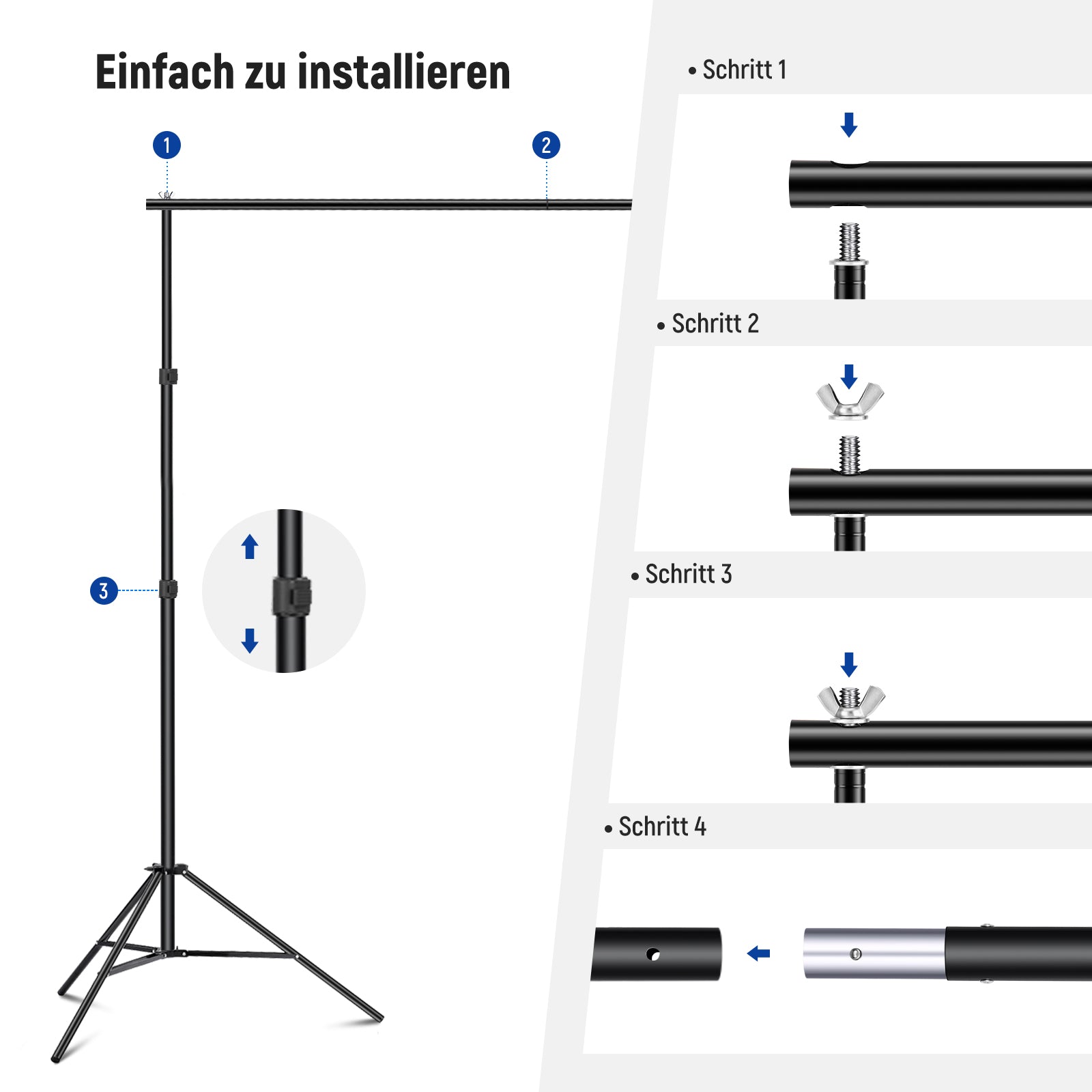 - Einstellbare Höhe und Breite: Mit einstellbarer Höhe (70cm–2,1m) und Breite (1,5–3m). Das Hintergrund Unterstützungssystem hält Ihren Hintergrund an Ort und Stelle und hilft Ihnen, verschiedene Hintergründe für Ihre Fotos zu erstellen