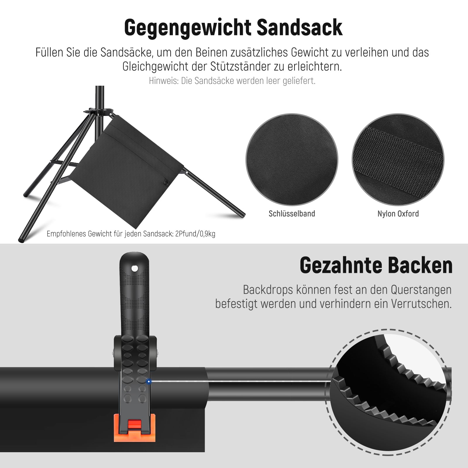 - Stabiler Hintergrundständer: Der Hintergrundständer aus Aluminiumlegierung ist langlebig und stabil mit einer Tragfähigkeit von bis zu 5kg. Für zusätzliche Stabilität sind zwei leere Nylon Sandsäcke enthalten