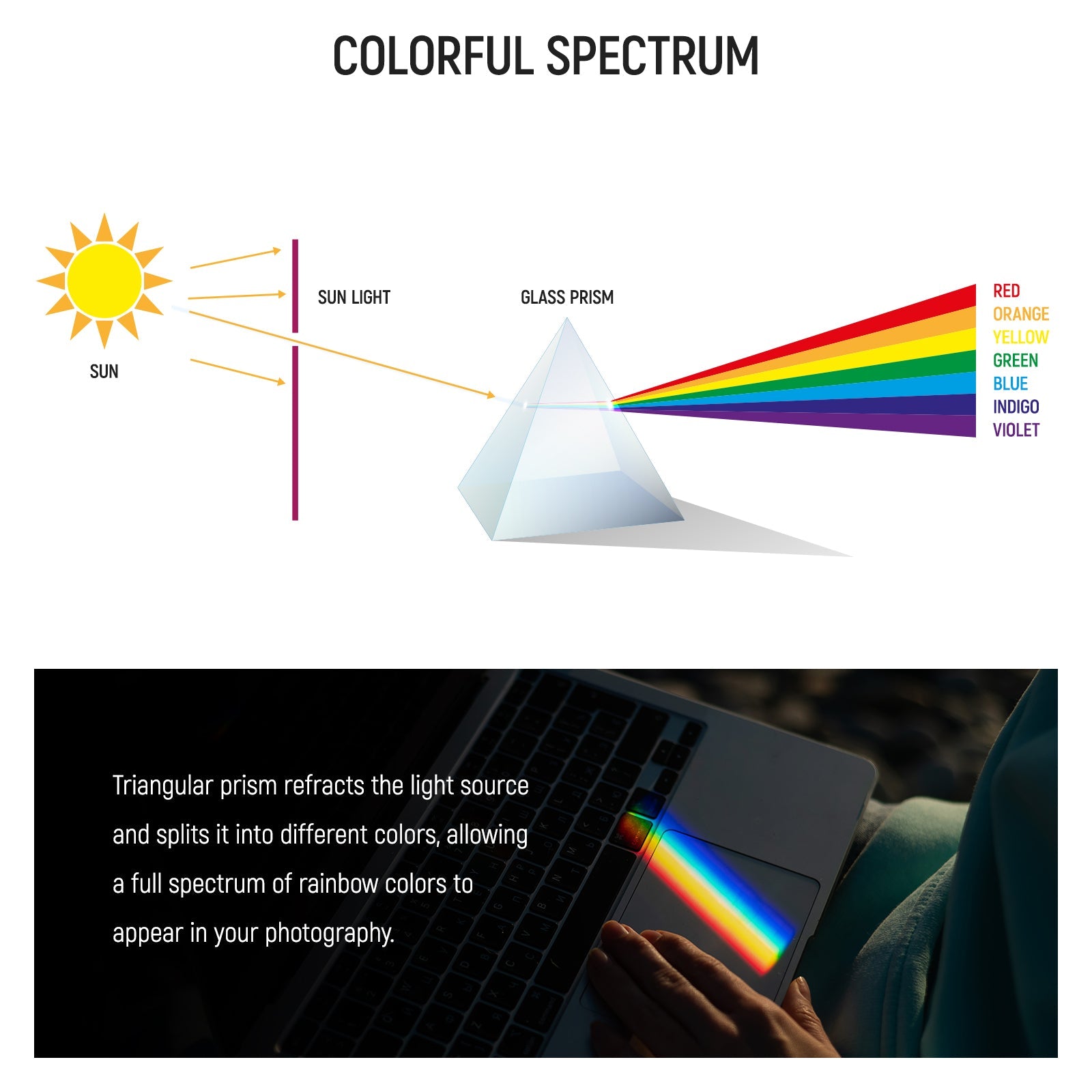 - 【Buntes Spektrum】 Das dreieckige Prisma bricht eine Lichtquelle und spaltet sie in verschiedene Farben auf, sodass auf Ihrer Fotografie ein vollständiges Spektrum an Regenbogenfarben erscheint