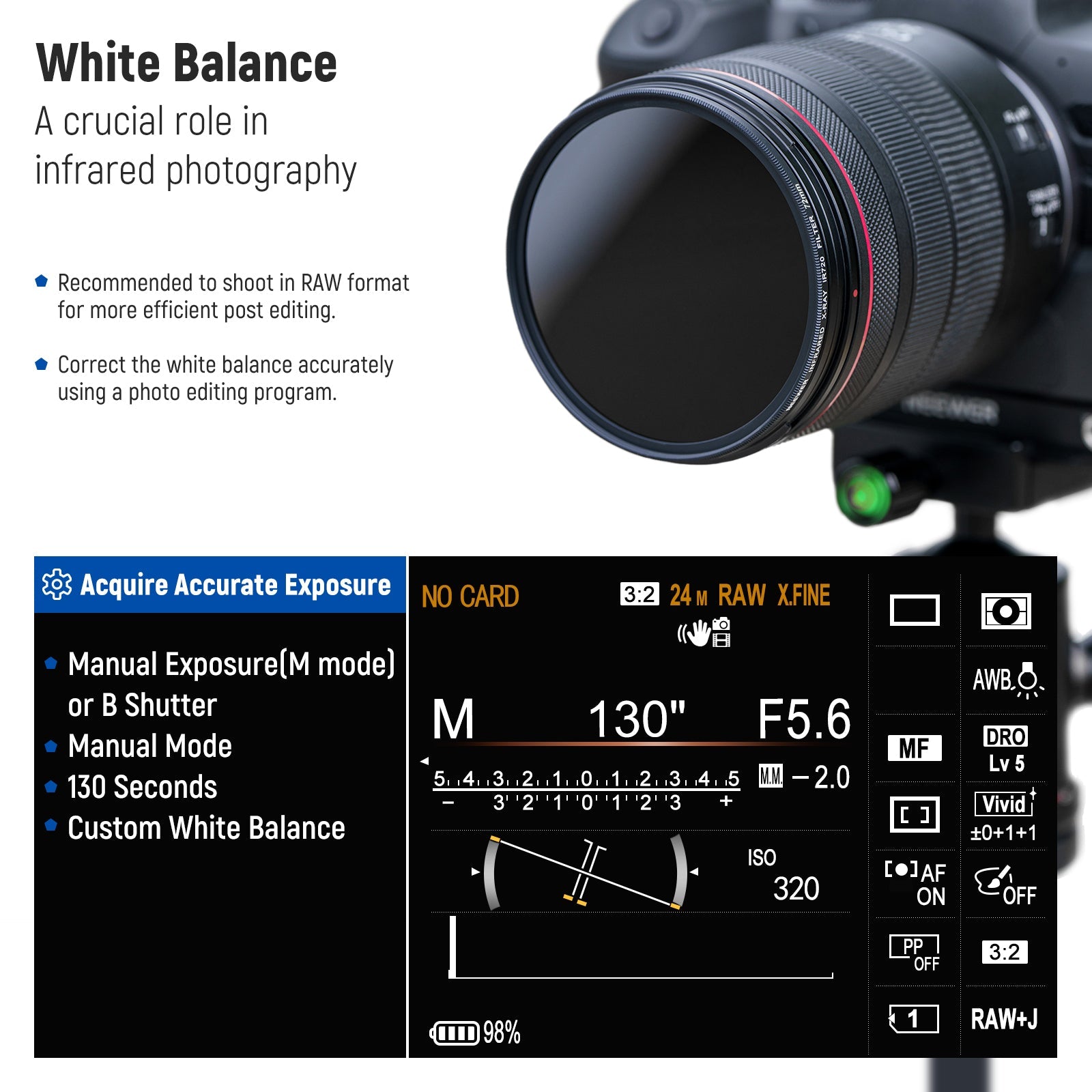 - 【HINWEIS】 1. Bitte stellen Sie zunächst einen benutzerdefinierten Weißabgleich für Ihre Kamera ein. 2. Bitte stellen Sie die Kamera auf den manuellen Modus und machen Sie ein paar Testaufnahmen, um die beste Belichtungszeit zu finden. Bei Verwendung von IR Filtern ist die Belichtungszeit relativ lang