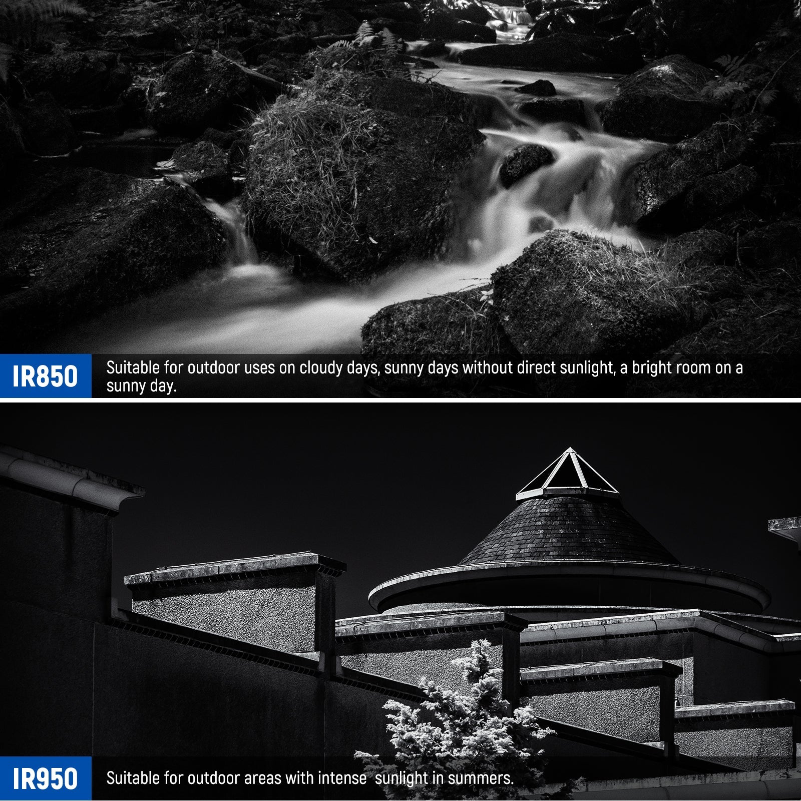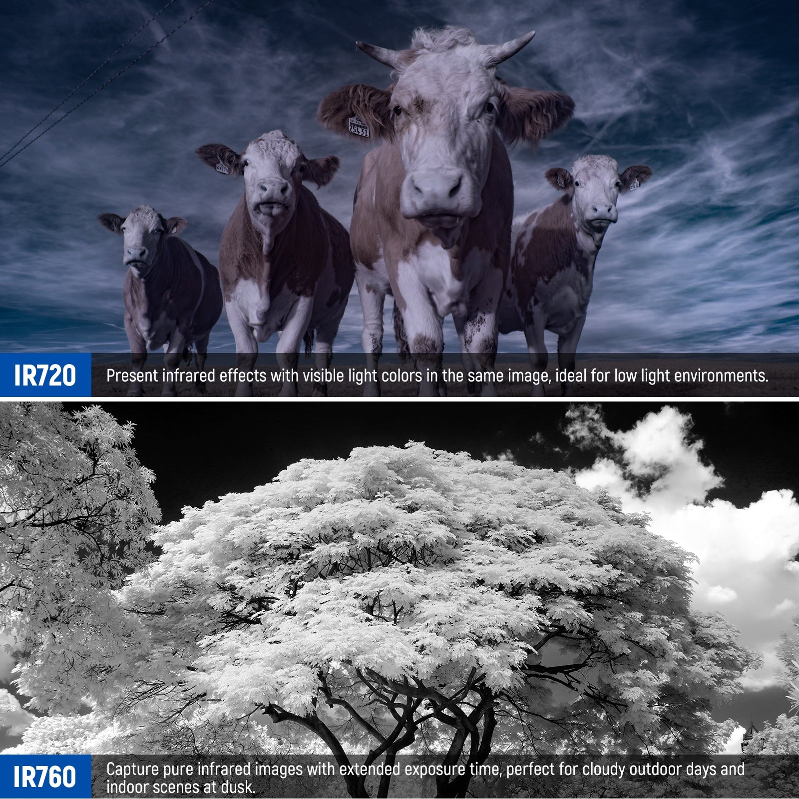 - 【Unglaubliche Infraroteffekte】 IR720 IR760 IR850 IR950 Filter blockieren jeweils Infrarotstrahlen über 720nm/760nm/850nm/950nm und erfassen einen Teil der Bilder außerhalb des für den Menschen sichtbaren Spektrums, was zu einem unverwechselbaren Look mit einer surrealen und ätherischen Atmosphäre führt