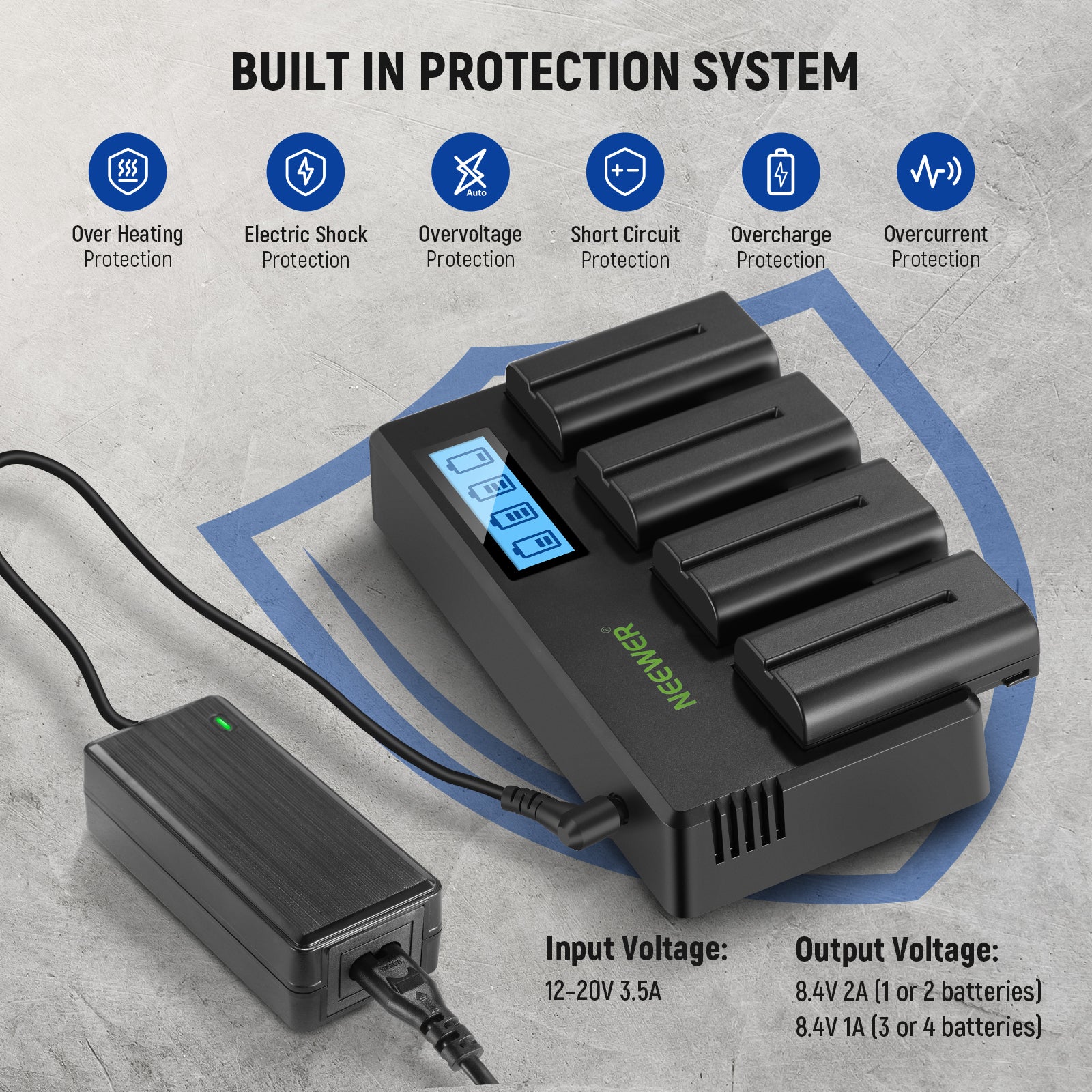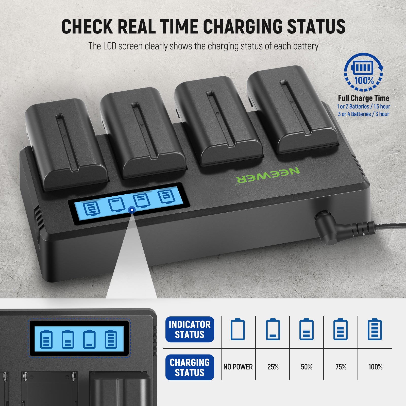- 【4 Kanalige Ladegerät】 Das Ladegerät kann gleichzeitig vier NPF550 Akkus aufladen. Es liefert 2 A Strom beim Laden von 1 oder 2 Akkus und 1 A Strom beim Laden von 3 oder 4 Akkus. Ein hintergrundbeleuchteter LCD Bildschirm zeigt den Ladestatus jedes Akkus an