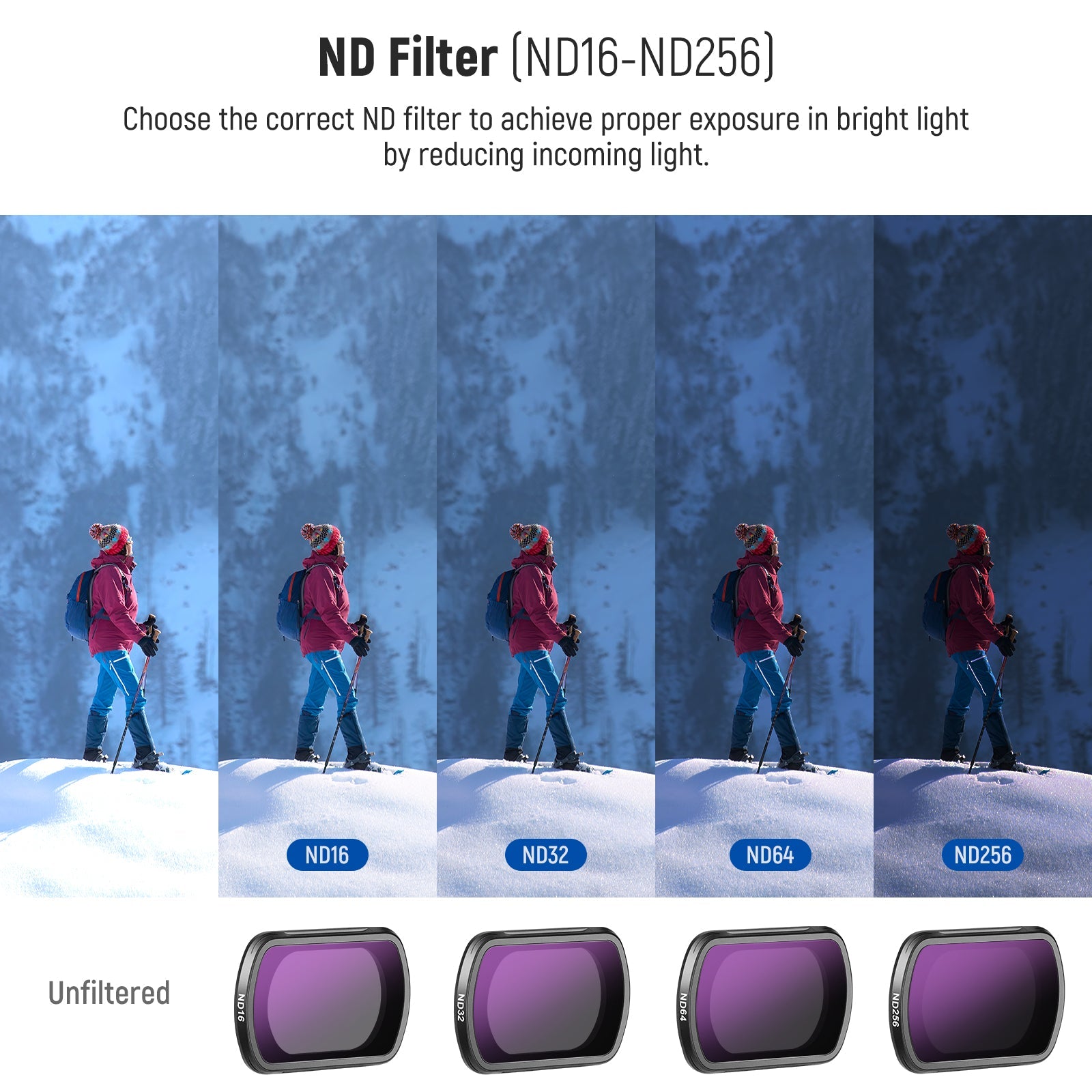 - 【Ausgewogene Belichtung für erstklassige Aufnahmen im Freien】 Die Actionkamerafilter ND16, ND32, ND64 und ND256 mit Lichtreduzierung um 4, 5, 6 und 8 Blenden sorgen für eine präzise Belichtungssteuerung bei dynamischen Aktivitäten im Freien. Sie verhindern wirksam eine Überbelichtung und verbessern die Bildqualität bei unterschiedlichen Sonneneinstrahlungsbedingungen
