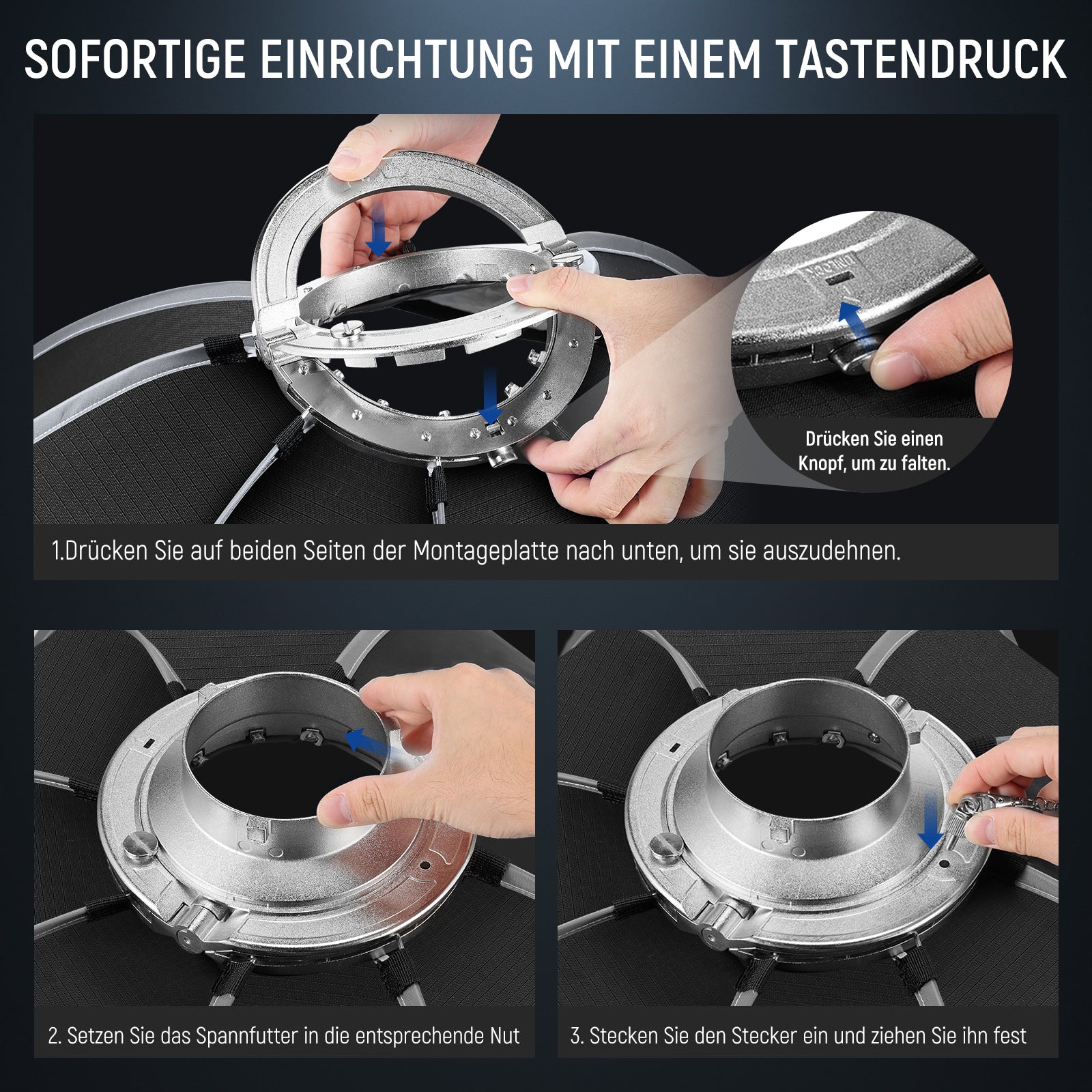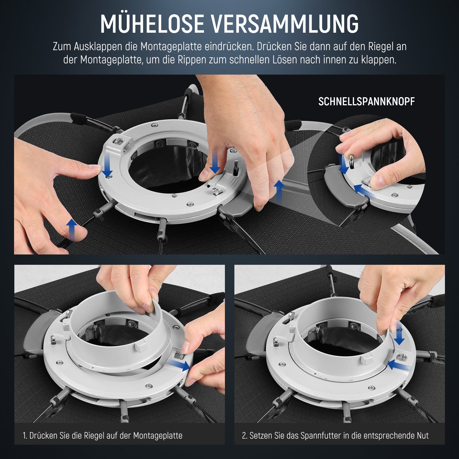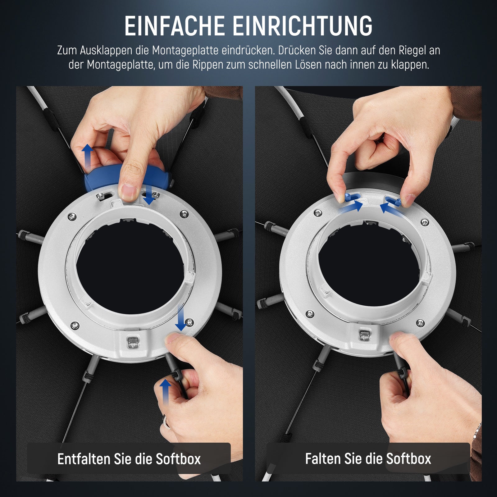 - Mühelose Montage- Mit einem einfachen Druck auf die Montageplatte entfaltet sich die Softbox mühelos und rastet an ihrem Platz ein. Die mitgelieferten Diffusorschichten und das Gitter werden mit Haken und Ösen befestigt und sind sofort einsatzbereit. Wenn es Zeit zum Zusammenpacken ist, drücken Sie die Riegel auf der Montageplatte und klappen Sie die Rippen zum schnellen Lösen nach innen. 8 elastische und starke Rippen verleihen dieser Softbox eine unvergleichliche Haltbarkeit