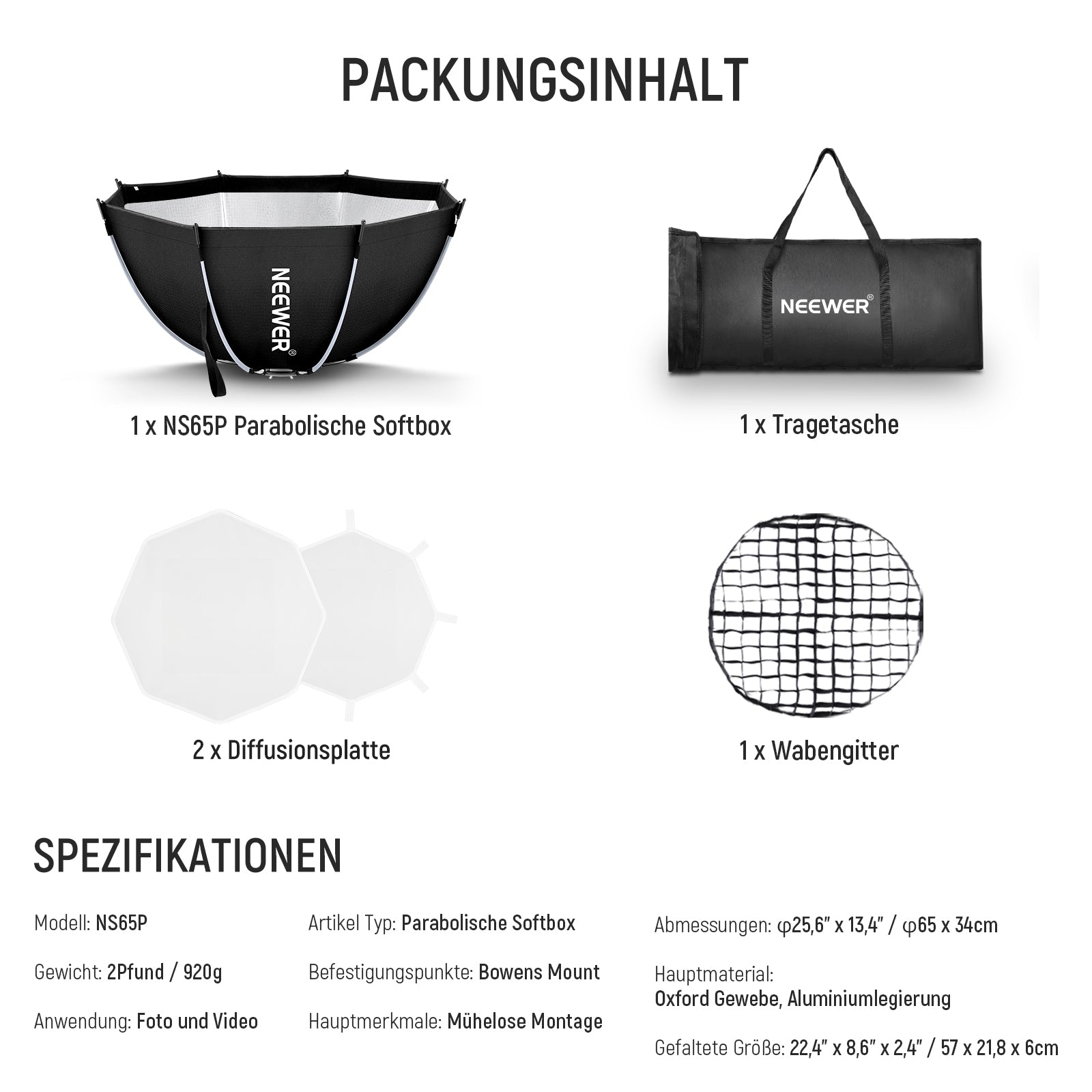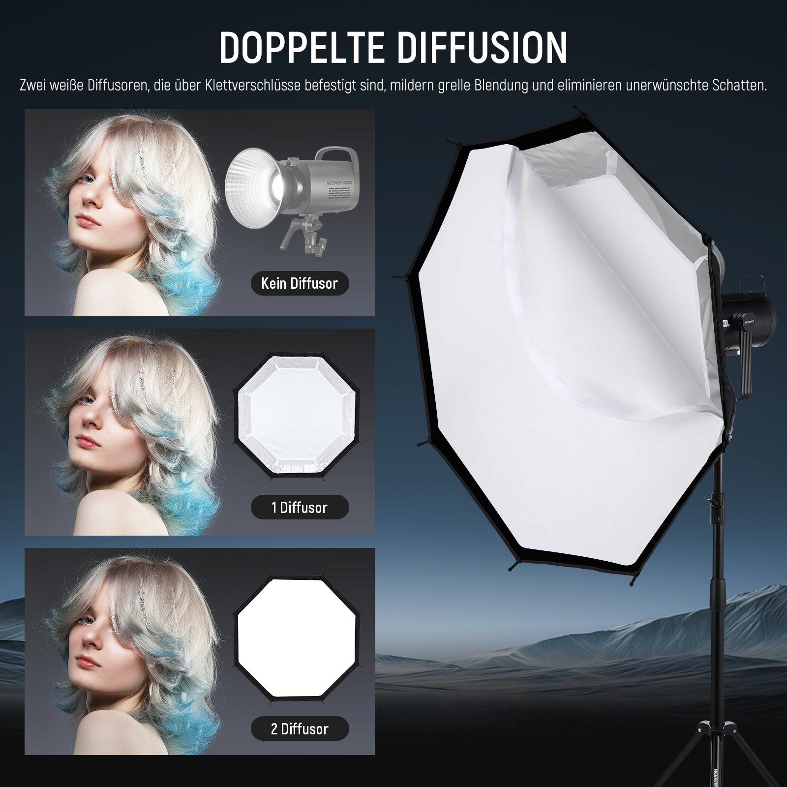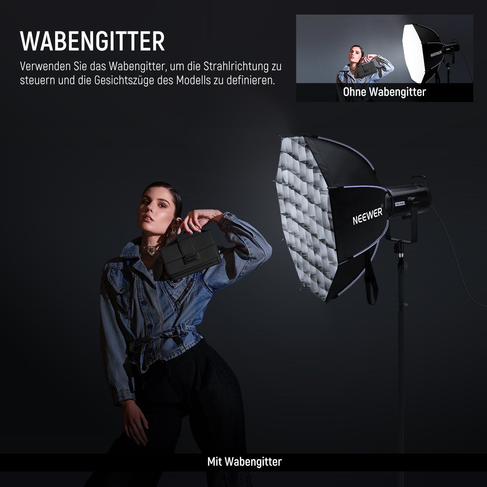 - Wabengitter und Diffusoren- Das Softbox Beleuchtungsset beinhaltet interne und externe Diffusoren, die für ein noch weicheres und diffuseres Licht kombiniert werden können. Das wabenförmige Gitter lenkt das Licht in einem Winkel von 45° und reduziert den Streulichtanteil, so dass ein unverwechselbarer, weicher und doch intensiverer Lichteffekt entsteht, der die Gesichtsstruktur des Modells definiert