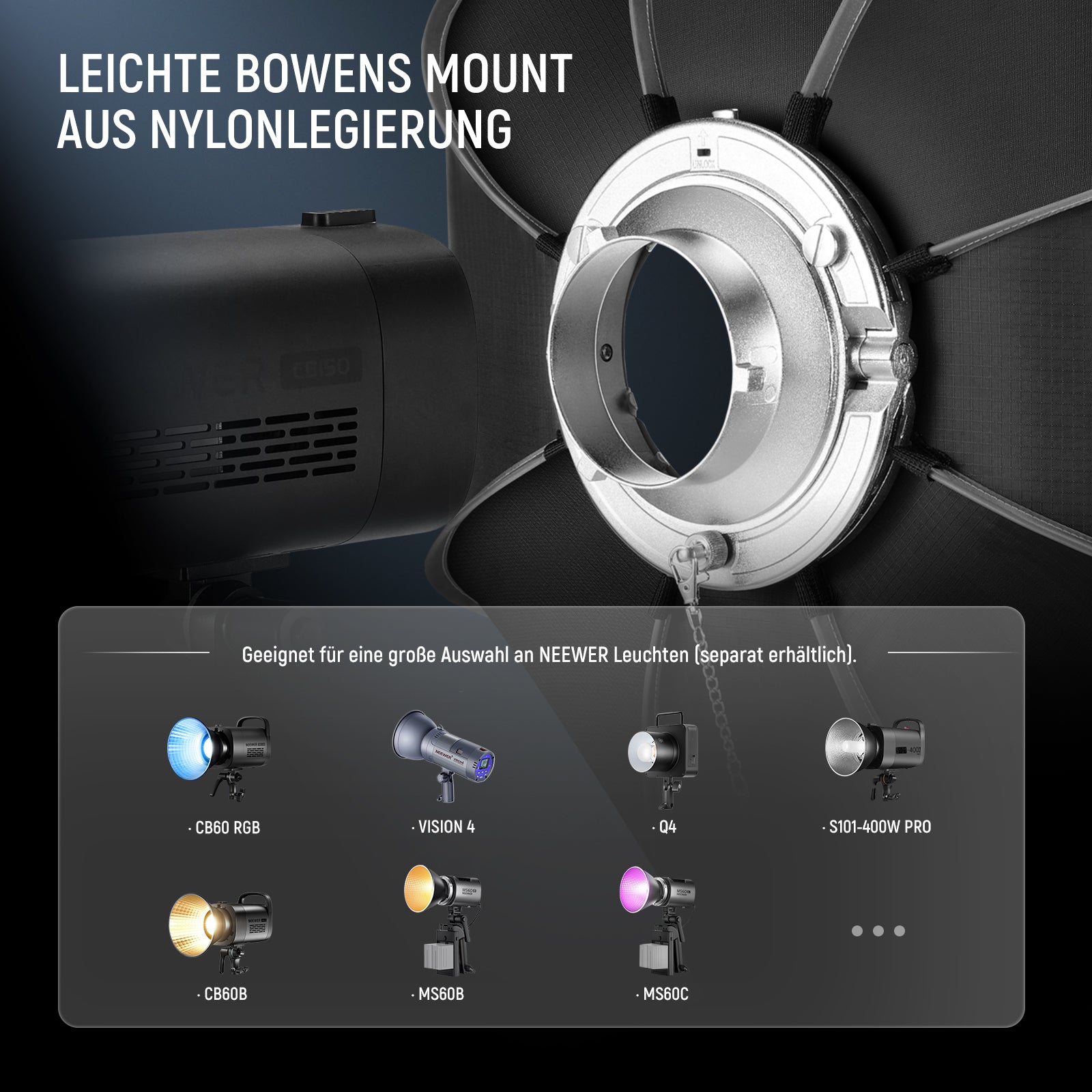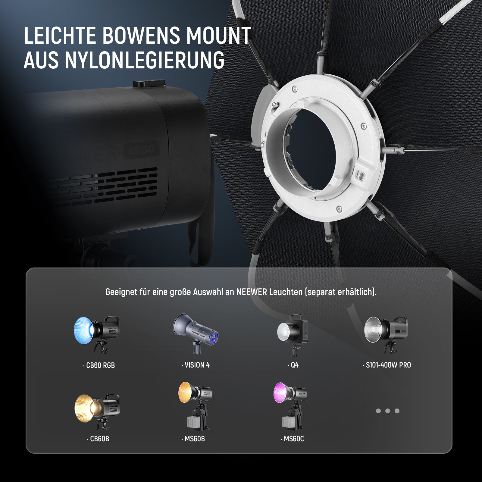 - Befestigung über Bowens Mount- Die Octagon Softbox wird über die Bowens Mount angeschlossen und ist kompatibel mit Godox SL60w, kompatibel mit SmallRig RC 120D RC 120B und NEEWER Q4, AS600B, CB300B, CB300C, CB200, CB200B, CB60, CB60B, S101-300W PRO, S101-400W PRO, S102-400W PRO, Vision 4, Q300 und anderen Studioblitzleuchten und kontinuierlichen LED Videoleuchten mit Bowens mount