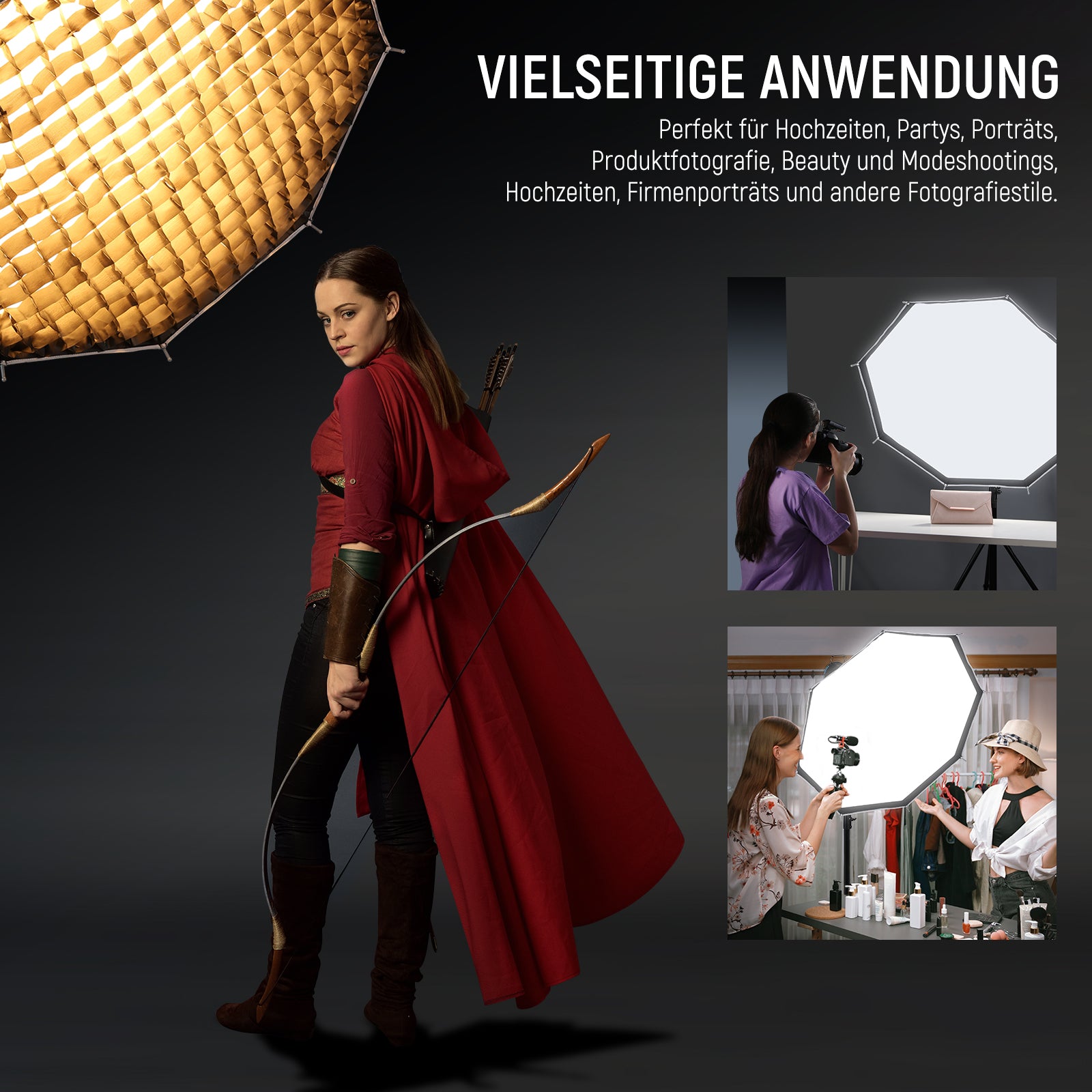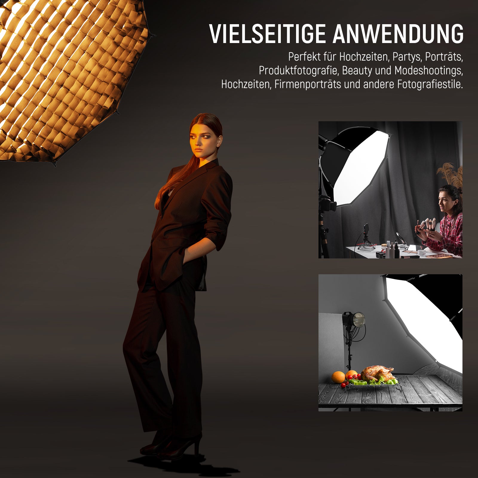 - Professionelle achteckige Soft Box- Diese Octagonal Softbox verfügt über eine glatte, gleichmäßige silberne Innenbeschichtung auf dem verdickten Nylongewebe, die das Licht verbreitert, streut und weicher macht, während die naturgetreue Farbwiedergabe beibehalten wird. Enthält zwei Schichten Lichtdiffusoren und ein Wabengitter für optimale Leistung