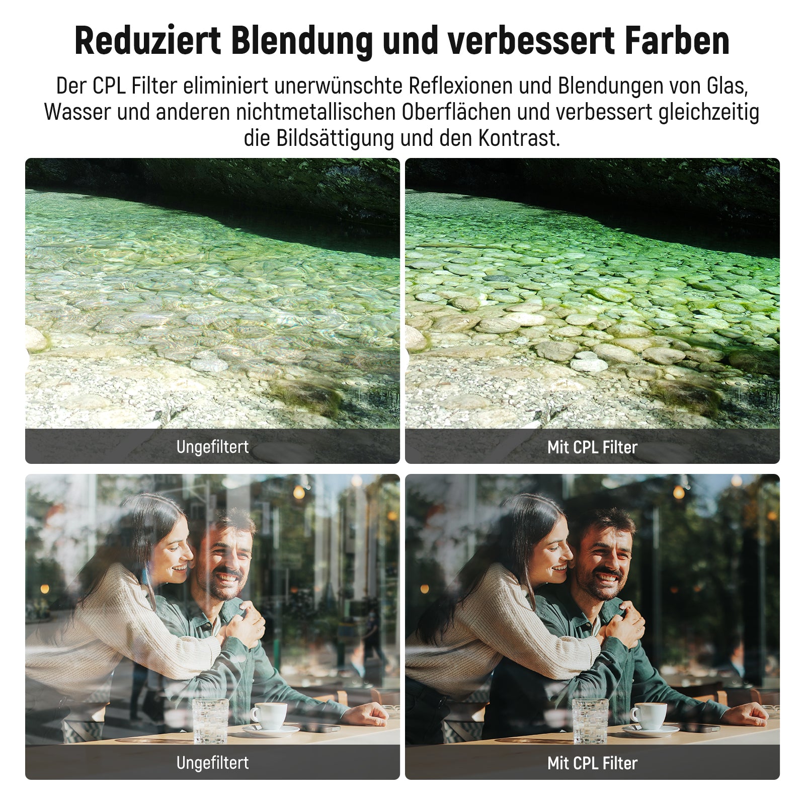 Minimale Spiegelungen, intensivere Farben- Der 67mm CPL Filter (zirkularer Polarisationsfilter) eliminiert Reflexionen von Wasser, Glas und anderen nichtmetallischen Oberflächen und verbessert gleichzeitig den Kontrast und die Sättigung für lebendige Farben. Hinweis: Der Filter ist nicht mit Kameraobjektiven kompatibel