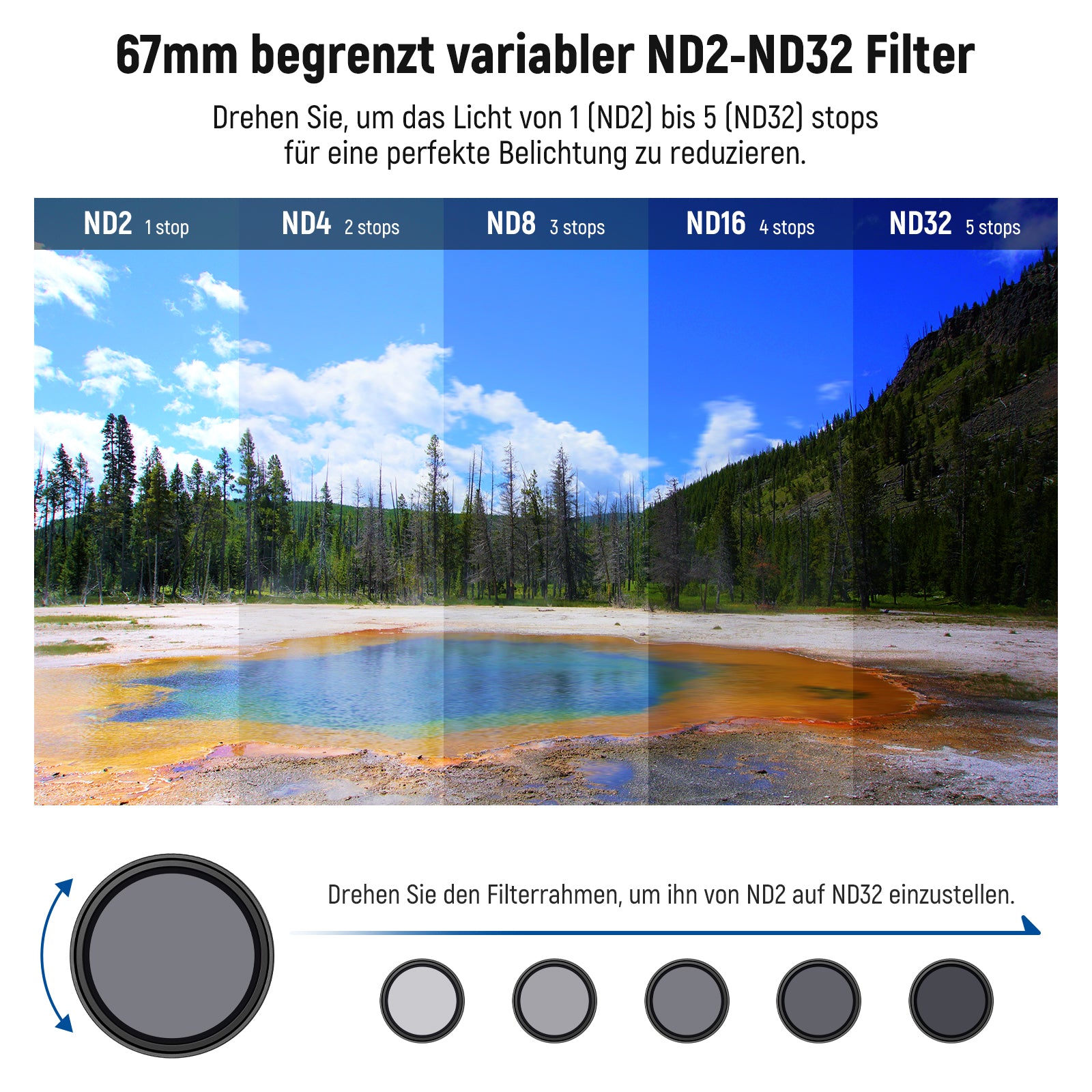- Einstellbarer Belichtungsausgleich- Dieser variable ND2-32 Graufilter reduziert das Licht um 1–5 Stops, um Überbelichtung bei unterschiedlichen Lichtverhältnissen zu vermeiden und dynamische Bewegungsunschärfeeffekte zu erzielen. Drehen Sie den äußeren Rahmen einfach bis zur genauen Stop Markierung, um eine präzise Einstellung zu erzielen. Hinweis: Der Filter ist nicht mit Kameraobjektiven kompatibel