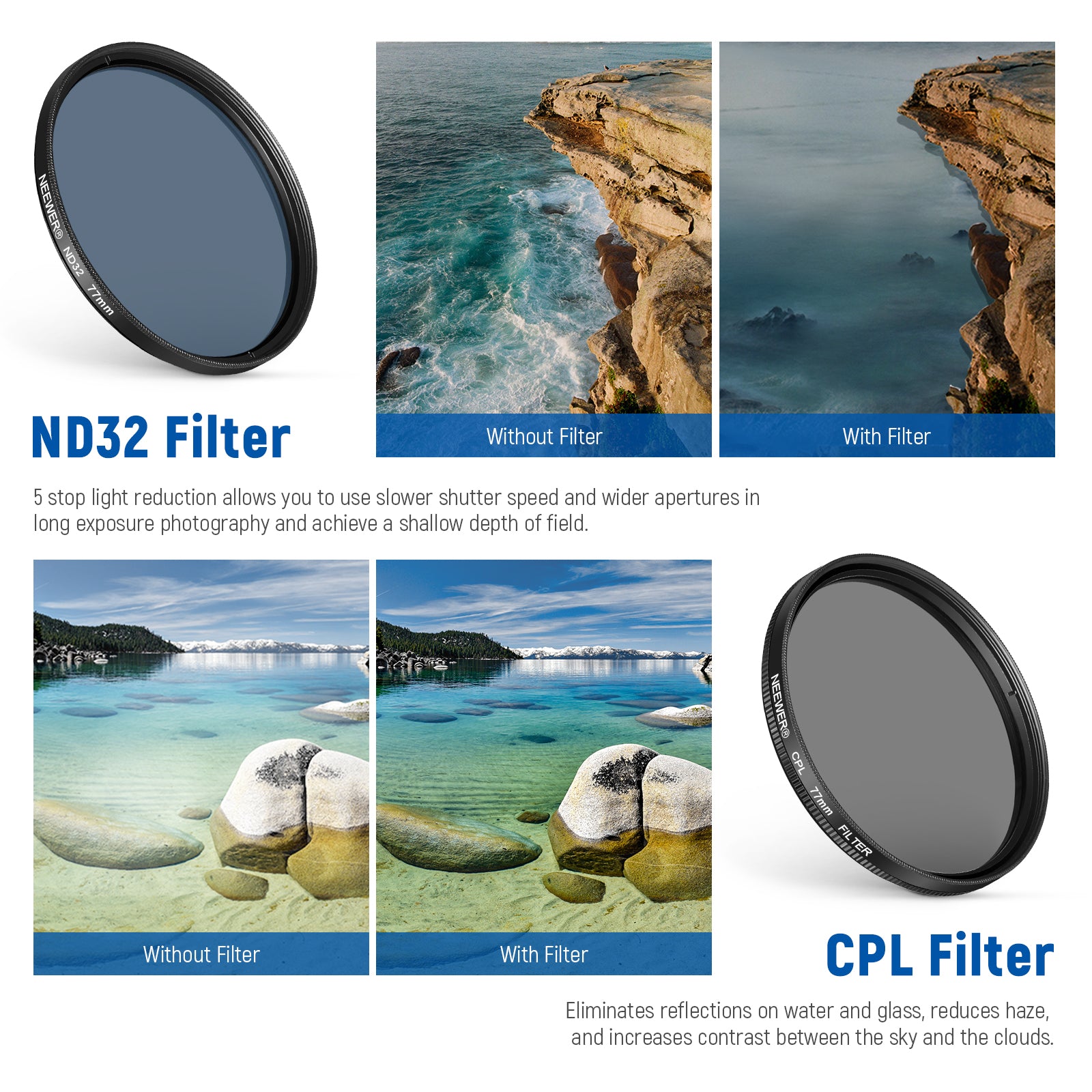- 【Neutraldichtefilter】 Der ND32 Filter reduziert das in den Kamerasensor eintretende Licht um 5 Stufen, ohne die Farbe zu ändern. Sie können eine längere Verschlusszeit für kreative Fotos oder eine größere Blende für eine geringere Schärfentiefe verwenden