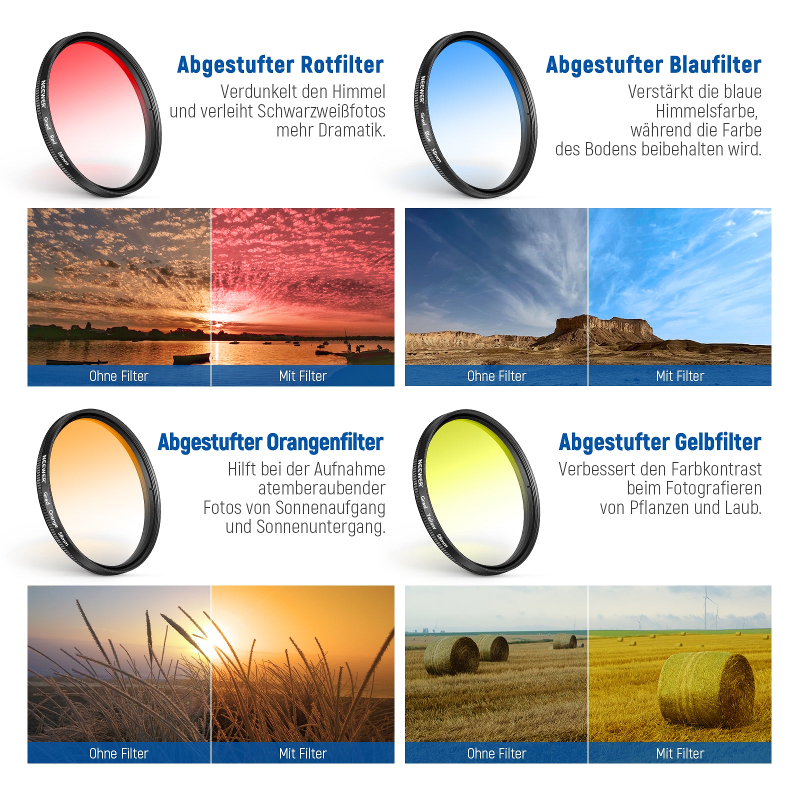 - 【Abgestufte Farbfilter】 Die vier Farbfilter bestehen aus Harz und sind mit Doppelgewinde versehen, sodass Sie Filter stapeln können, was bedeutet, dass Sie einem Teil des Bildes eine Farbe hinzufügen können, ohne die Farbe des anderen Teils zu ändern. Sie können dabei helfen, die Stimmung Ihrer Fotos zu verändern – ideal für Landschaftsfotografie und Fotografie von Sonnenauf- und -untergängen