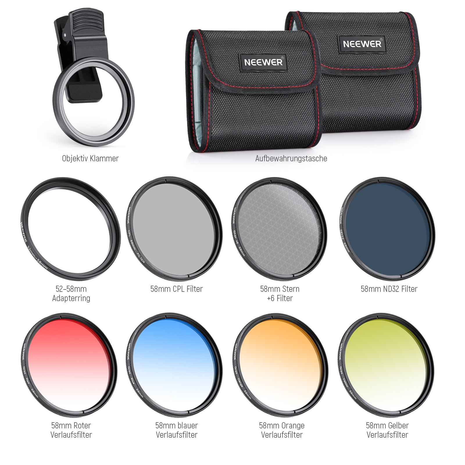 - 【Filterset für Telefonkameraobjektive】 Dieses 55mm Filterset enthält 4 abgestufte Farbfilter (rot, orange, gelb und blau), einen CPL Filter, einen ND32 Filter, einen 6 Punkt Sternfilter und eine Telefonobjektivklammer, welche sogar auf die meisten Handys und auf mehrere Kameras passt und einen 52-55mm Adapterring, der mit allen DLSR Kameras mit 52mm und 55mm Objektiven kompatibel ist