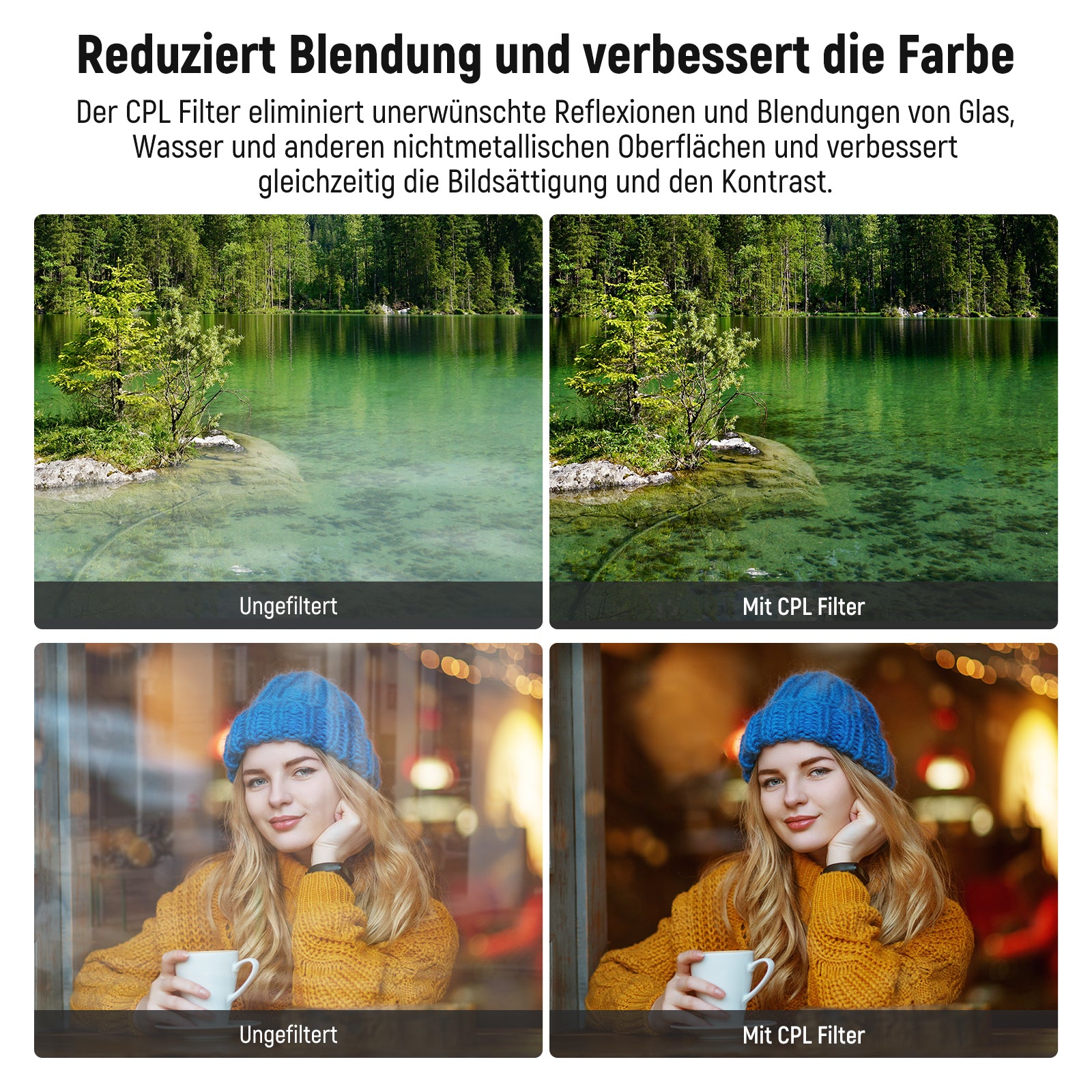 - CPL Filter für Handy Aufnahmen- Reduziert Reflexionen auf nicht metallischen Oberflächen und verbessert die Bildfarbe, perfekter Zirkularpolarisator zum Aufnehmen von blauem Himmel, Wolken, Wasser, Schnee, Pflanzen und Landschaften mit Ihrem Telefon als unverzichtbare Fotoausrüstung für Content Ersteller und Influencer. Hinweis: Nicht für Kameras