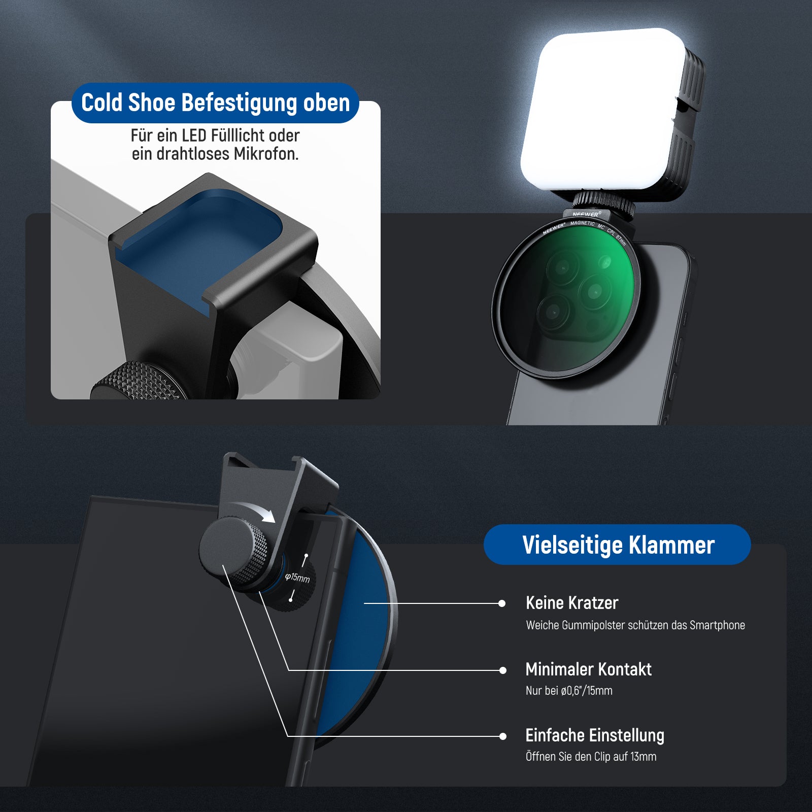- Cold Shoe Zubehör Befestigung- An die Cold Shoe Halterung des Objektivclips kann ein kleines Zubehörteil befestigt werden, um die Aufnahmequalität zu verbessern, wie z. B. RGB61 LED Videoleuchte oder KM17 Plug & Play Mikrofon
