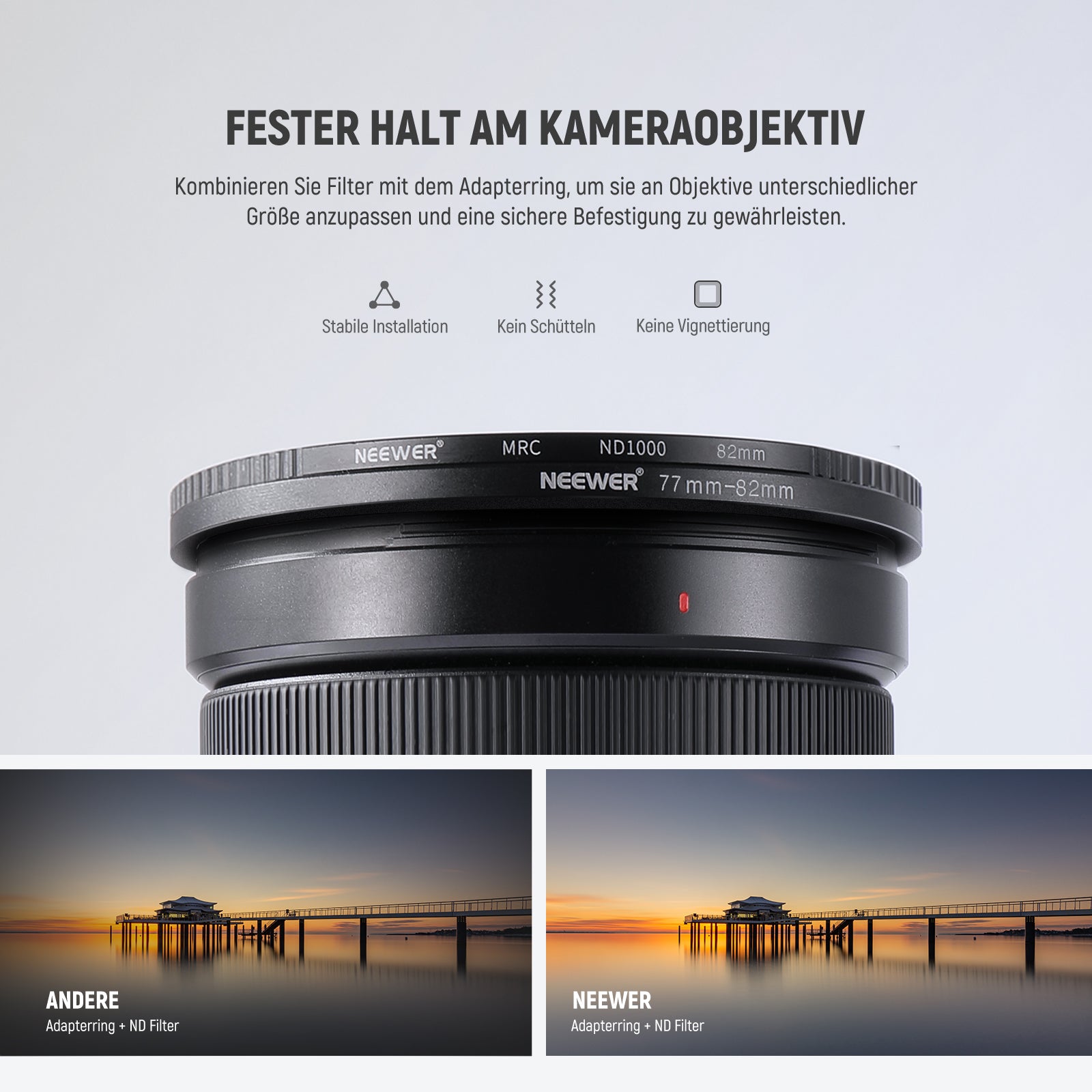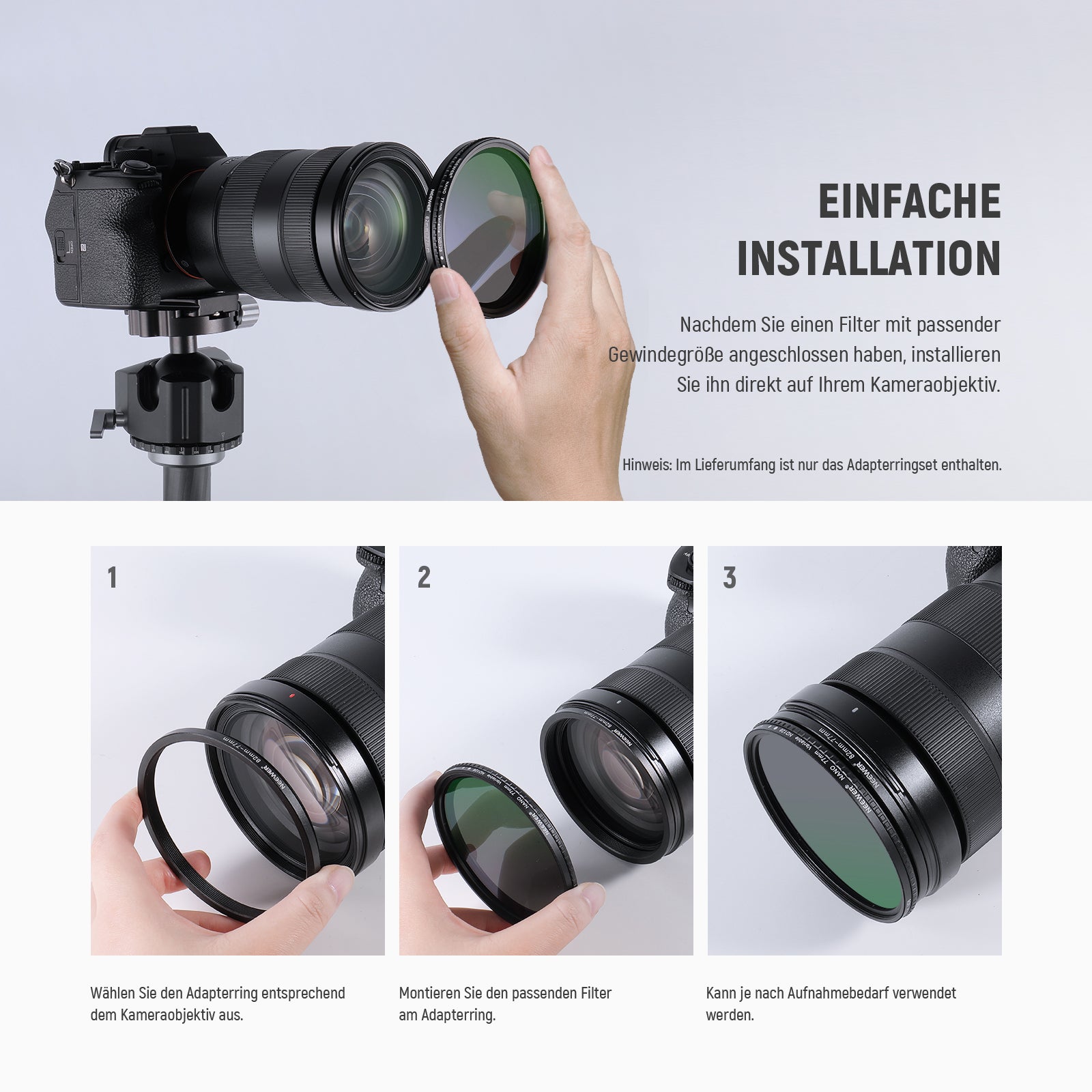 - ANWENDUNG: Geben Sie eine Möglichkeit an, Filter oder Zubehör mit größerem Durchmesser auf einer kleineren Linse zu platzieren. Sie müssen keine Filter mehr kaufen, wenn Sie verschiedene Objektive haben.