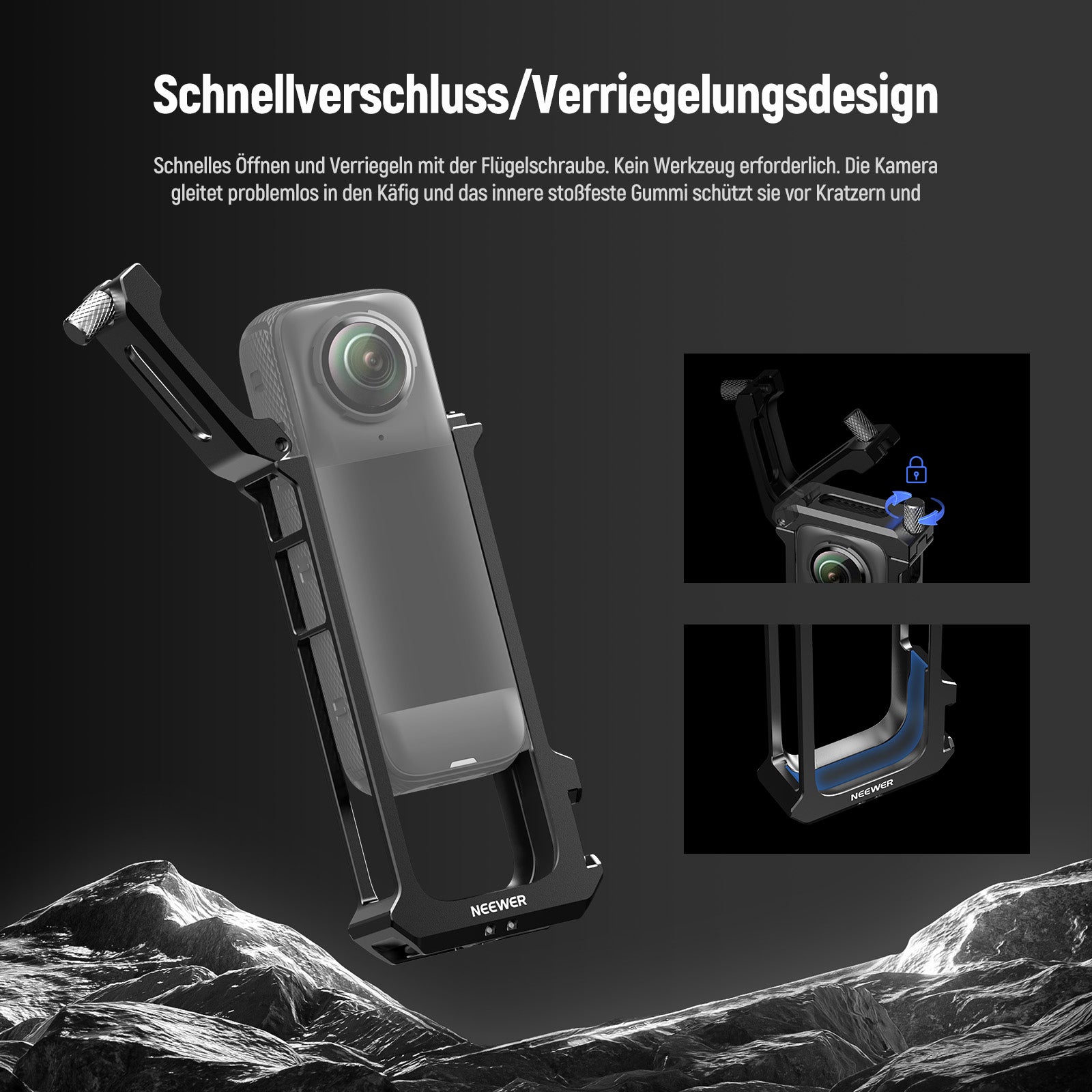 - Schnellverschluss/Verriegelungsdesign- Öffnen und verriegeln Sie den Käfig schnell mit einer Schraube, keine Montage erforderlich. Die Kamera gleitet reibungslos in den Käfig und das innere stoßfeste Gummi schützt sie vor Kratzern und Stößen