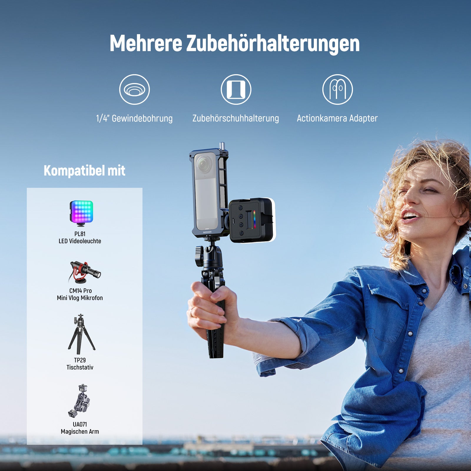 - Mehrere Zubehörhalterungen- Zubehörschuh und 1/4" Gewinde mit verdrehsicheren Positionierungslöchern können eine LED Videoleuchte (PL81), ein Minimikrofon (CM14 PRO), ein Tischstativ (TP29) oder einen Magischer Arm (UA071) für eine verbesserte Aufnahmequalität montieren. Funktioniert auch mit dem NEEWER UA030 Zubehörschuh Adapter, der mit DJI MIC kompatibel ist. Standard Klappfinger können mit einer Vielzahl von Action Kamera Zubehör verwendet werden
