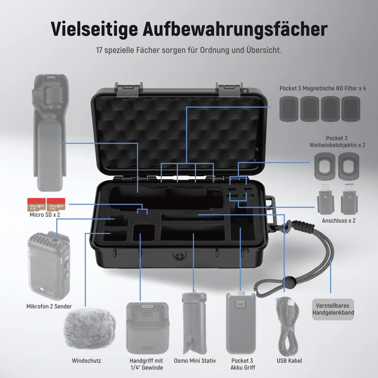 • Vielseitige Aufbewahrungsfächer- 17 speziell gestaltete Fächer sorgen für Ordnung und Organisation: 1x Fach für Pocket 3, 4x Fach für ND Filter, 2x Fach für Weitwinkelobjektive, 2x Fach für OTG Adapter, 2x Fach für Micro SD Karten, 1x Fach für Mic 2 Transmitter (kompatibel mit DJI Mikrofonen wie Mic Mini oder Mic 2), 1x Fach für Windscreen, 1x Fach für Griff mit 1/4" Gewinde, 1x Fach für Mini Stativ, 1x Fach für Batteriegriff und 1x Fach für USB Kabel