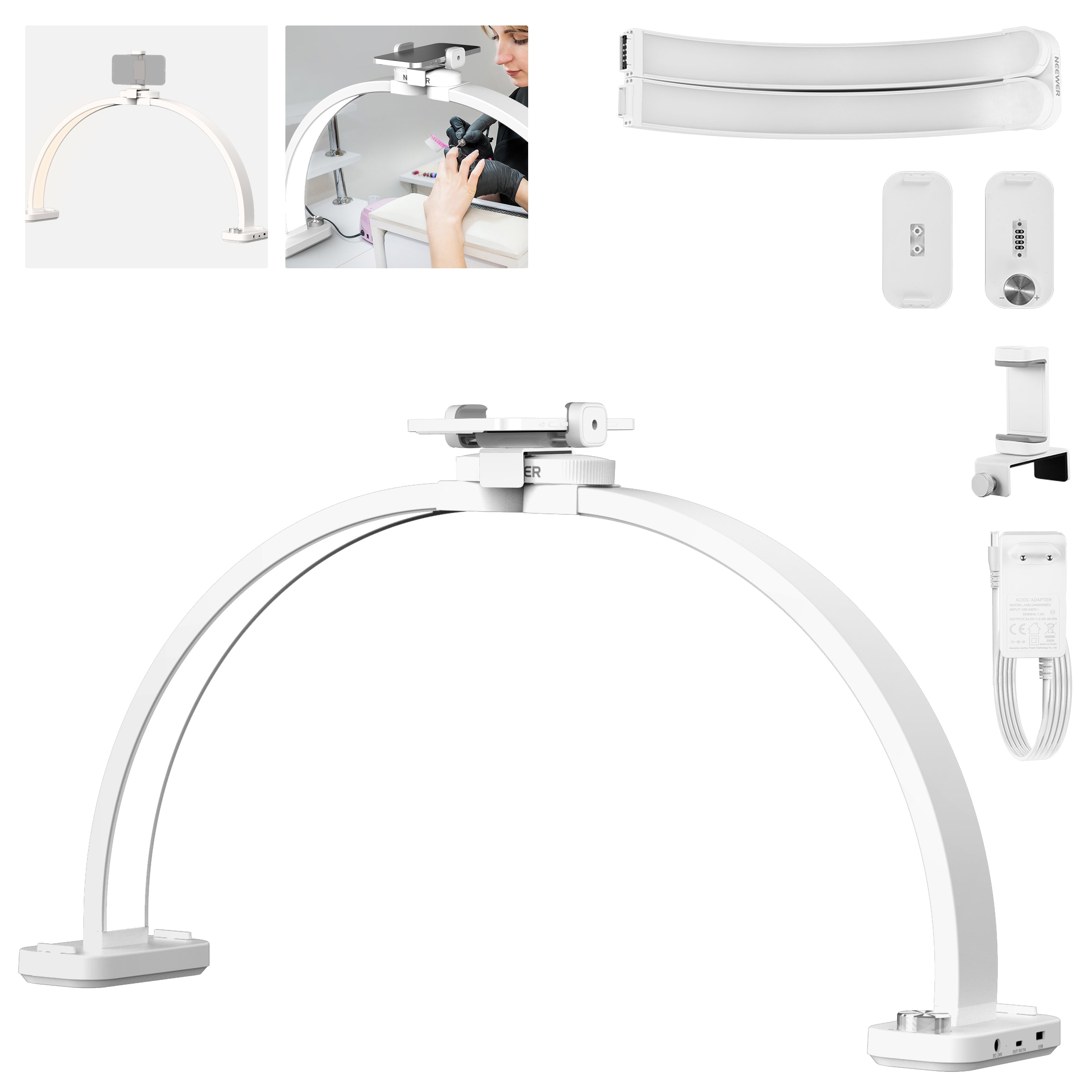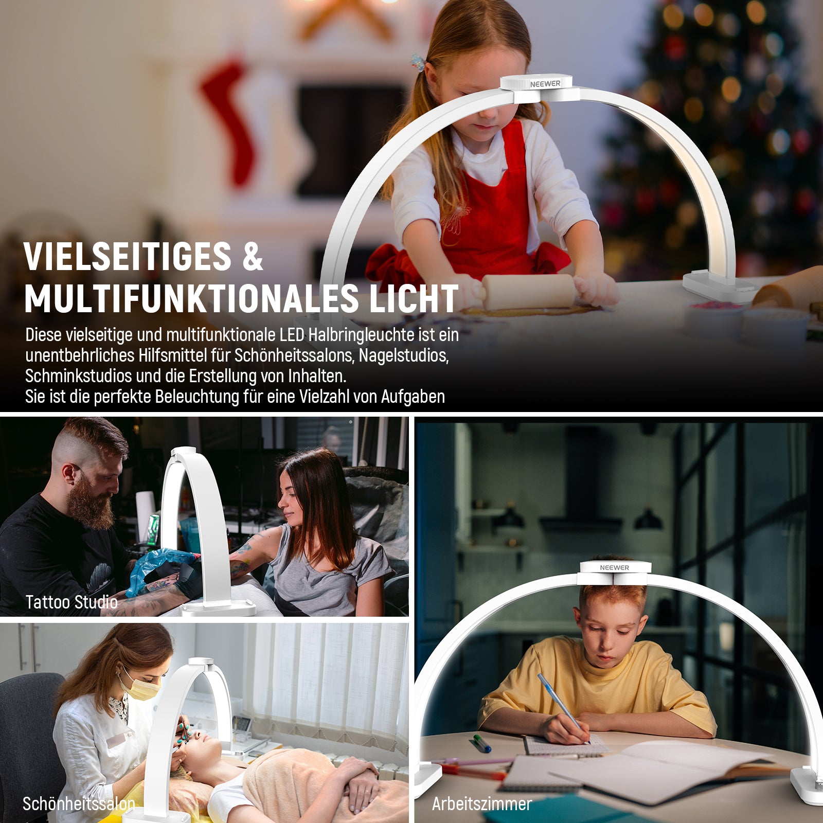 Vielseitiges und multifunktionales Licht- Diese vielseitige und multifunktionale LED Halbring Halo Lampe ist unverzichtbar für Schönheitssalons, Nagelstudios, Make up Artist Studios und Inhaltersteller. Sie ist die perfekte zentrale und sanfte Beleuchtung für Maniküre, Schminken, Wimpernverlängerung, Tätowierkunst, Tutorial Fotos und Aufnahmen. Ein absolutes Muss für Influenzer und Streamer, um Nagelpflege Videos zu filmen oder Live zu Streamen und Luftaufnahmen zu machen