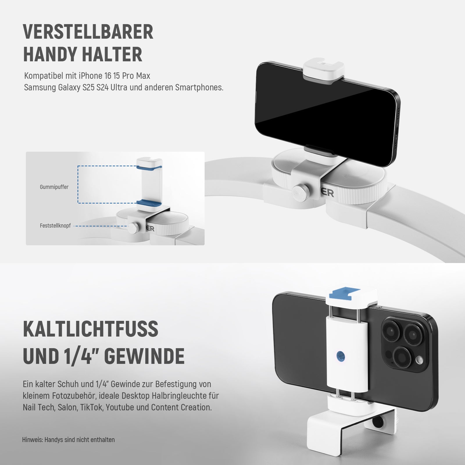 - Verstellbarer Handyhalter- Der Handyhalter dieses NEEWER LED Halbkreisringlichts für den Schreibtisch ist kompatibel mit iPhone 16 15 Pro Max Samsung Galaxy S25 S24 Ultra und anderen Handys. Er wird mit einem Feststellknopf an der Lampe befestigt und verfügt über Gummipolster, um Kratzer zu vermeiden. Ein Zubehörschuh und ein 1/4" Gewinde zur Befestigung kleiner Fotozubehörteile, ideale Tisch Halbringlichtbeleuchtung für Nagelplege, Selfies, Bilder, Videos für YouTube TikTok Soziale Medien