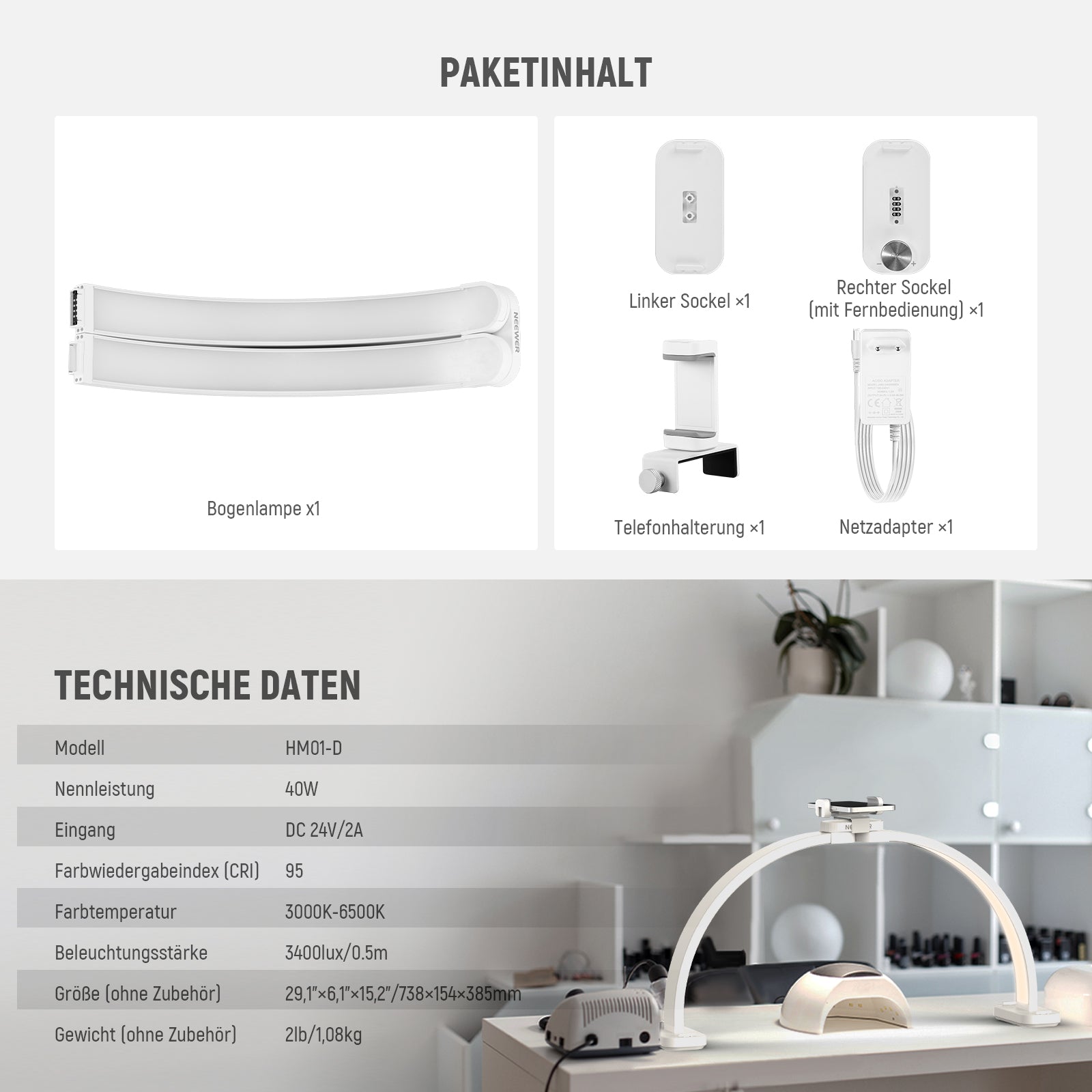 - Faltbare 29" LED Bogenlampe- Diese dimmbare, zweifarbige 29" Tisch LED Maniküre Armlampe für den Tisch bietet eine Leistung von 40W, einen Farbtemperaturbereich von 3000K bis 6500K, eine maximale Beleuchtungsstärke von 3400Lux/0,5m und CRI 95 für eine genaue Farbwiedergabe. Das faltbare Design dieser halbmondförmigen Nageltechnik Füllleuchte für den Schreibtisch ermöglicht eine einfache Lagerung und einen einfachen Transport und ist perfekt für Make up Artisten und Inhaltersteller unterwegs