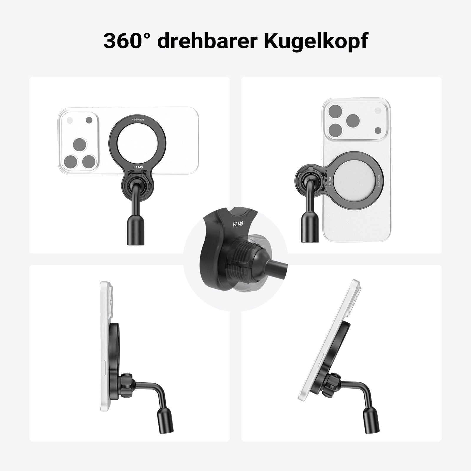 - 【360° Ball Head für flexible Winkel】 Der Kamera Smartphone Mount Halter, kompatibel mit Mag Safe, ermöglicht eine 360° Schwenkbewegung und lässt sich nahtlos vom Querformat in den Hochformatmodus umstellen – für flexibles und stabiles Filmen und Videografieren