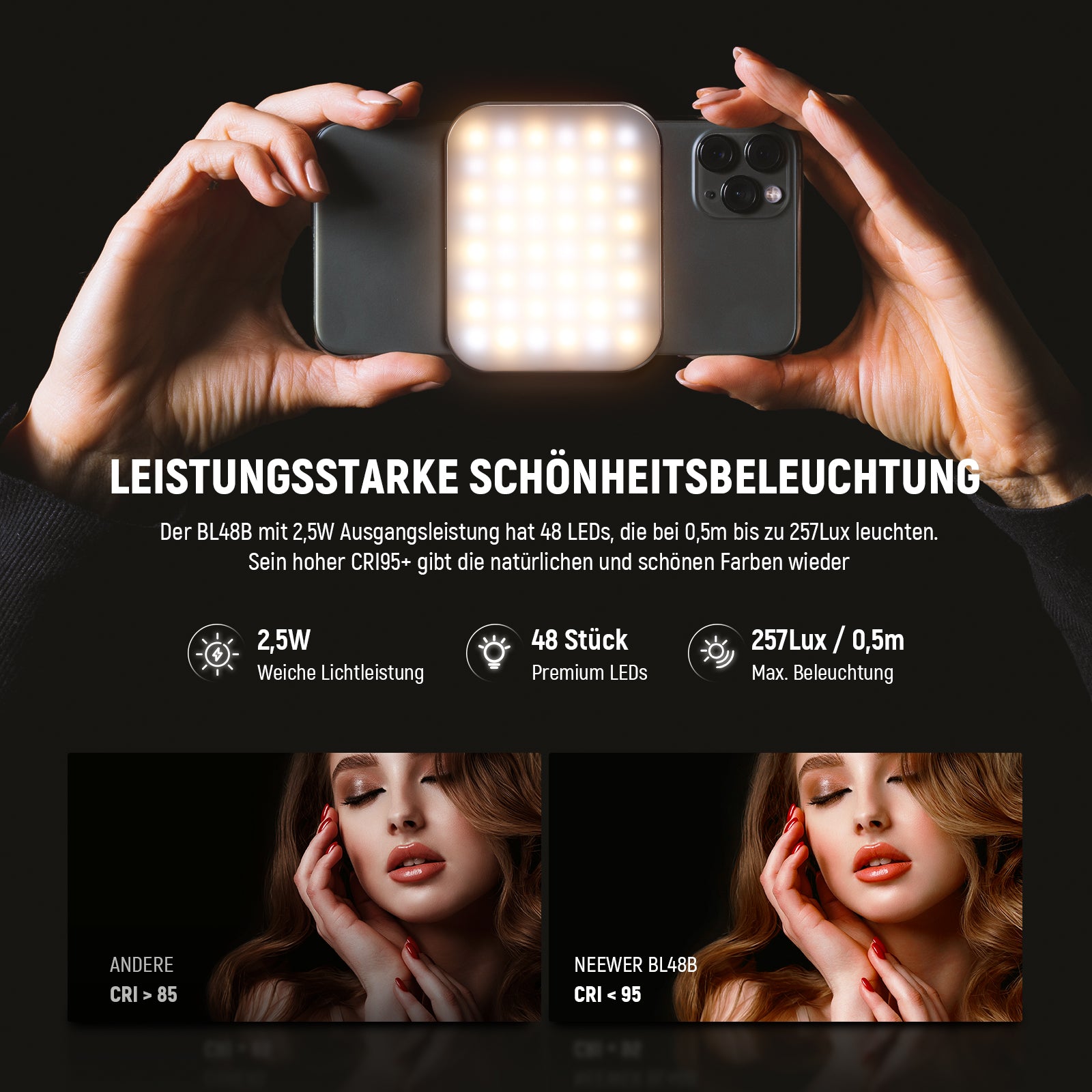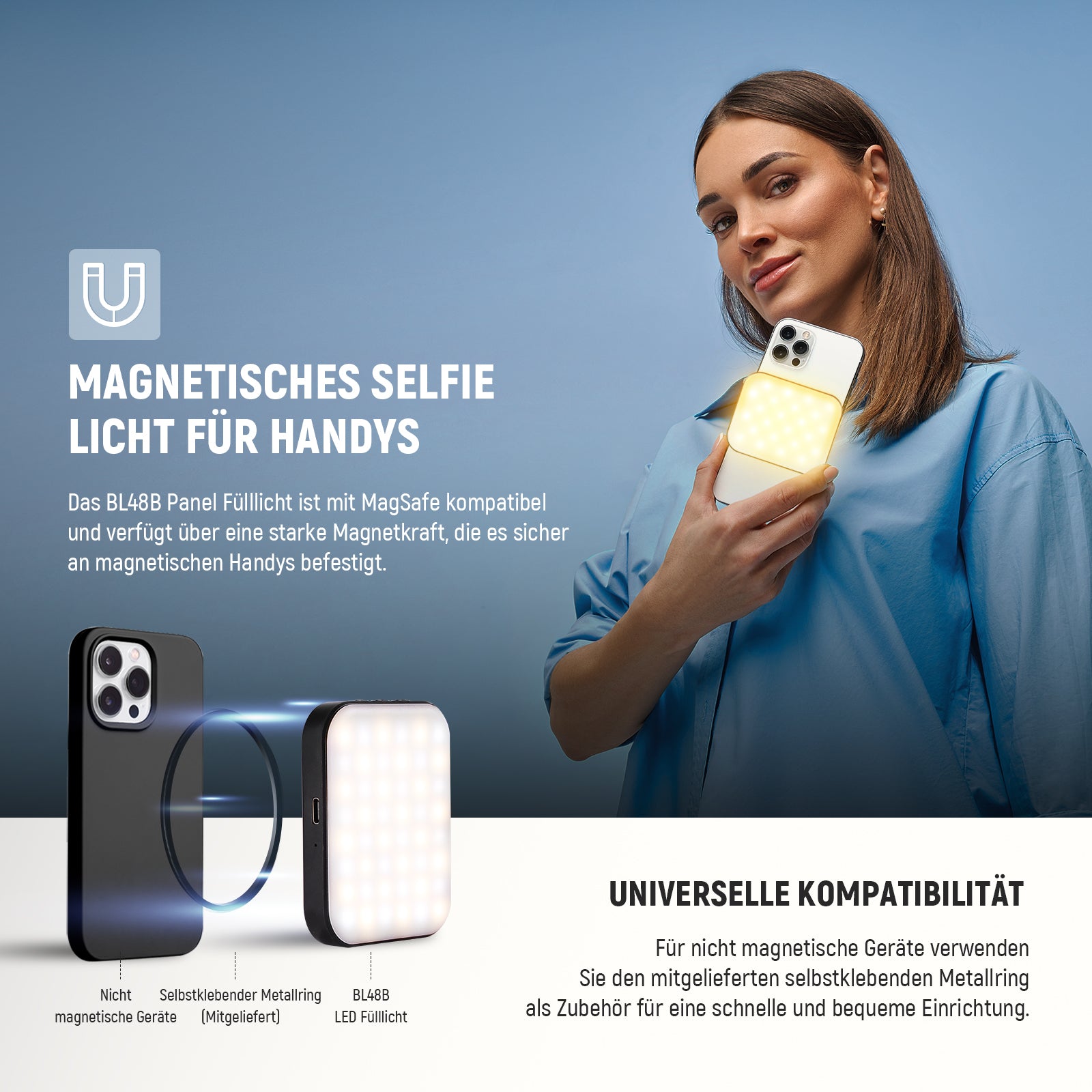 - Magnetisches Telefon Videoleuchte- Das BL48B Panel Video Licht ist mit MagSafe kompatibel und verfügt über eine starke Magnetkraft zur sicheren Befestigung kompatibel mit iPhone 16 Pro Max Plus 15/14/13/12 Mini iPad Pro Samsung Galaxy S24 S23 Ultra usw. Für nicht magnetische Geräte verwenden Sie den mitgelieferten selbstklebenden Metallring. Das BL48B mit 2,5W Ausgangsleistung hat 48 LEDs, die bis zu 257 Lx bei 0,5m beleuchten. Sein hoher CRI95+ erzeugt die natürlichen und schönen Farben