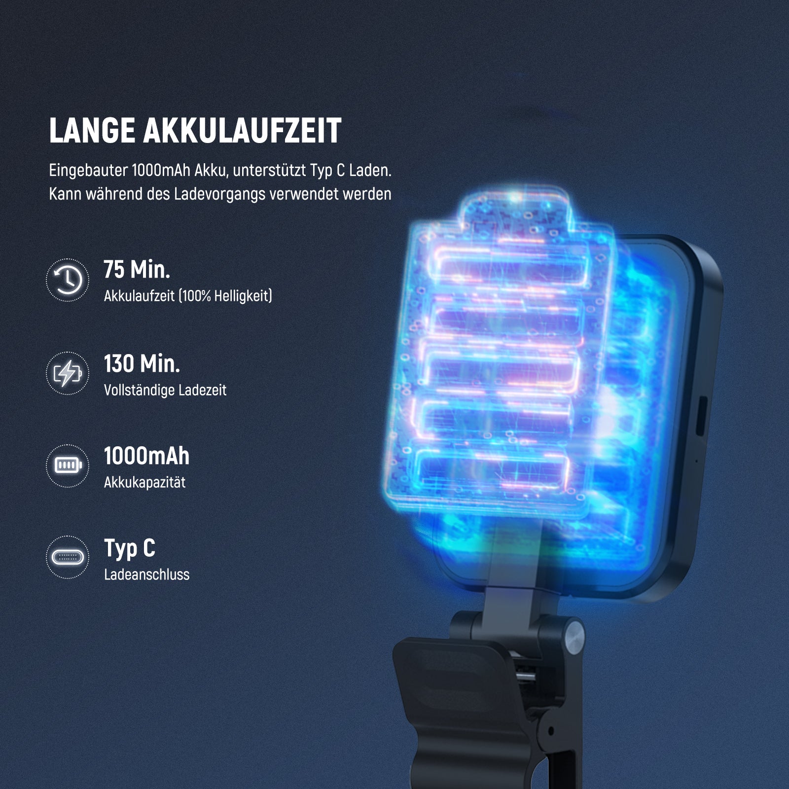 - 75 Minuten lange Laufzeit und schnelles Aufladen- Der 1000mAh Akku ermöglicht es dem LED Handylicht, 75 Minuten lang bei 100% Helligkeit zu arbeiten. Ein vollständiges Aufladen dauert nur 130 Minuten über ein tragbares Ladegerät oder einen Laptop mit dem mitgelieferten USB Typ C Kabel. Das Fülllicht kann während des Ladevorgangs verwendet werden, sodass Ihr Aufnahmevorgang nicht unterbrochen wird